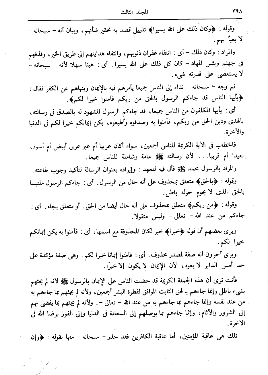 فالخطاب في الآية الكريمة للناس أجمعين، سواء أكان عربيا أم غير عربي أبيض أم أسود، بعيدا أم قريبا ... لأن رسالته صلى الله عليه وسلم عامة وشاملة للناس جميعا.