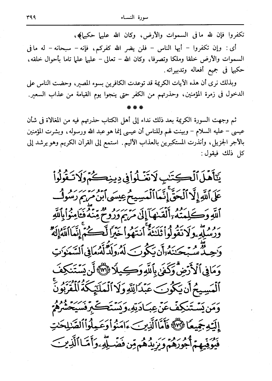 ثم وجهت السورة الكريمة بعد ذلك نداء إلى أهل الكتاب حذرتهم فيه من المغالاة في شأن عيسى- عليه السلام- وبينت لهم وللناس أن عيسى إنما هو عبد الله ورسوله، وبشرت المؤمنين بالأجر الجزيل، وأنذرت المستكبرين بالعذاب الأليم. استمع إلى القرآن الكريم وهو يرشد إلى كل ذلك فيقول: