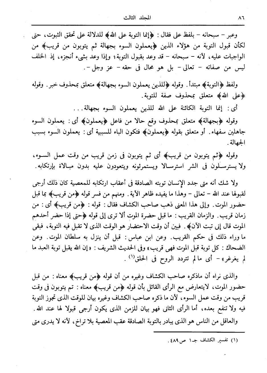 ولا شك أنه متى جدد الإنسان توبته الصادقة في أعقاب ارتكابه للمعصية كان ذلك أرجى لقبولها عند الله- تعالى- وهذا ما يفيده ظاهر الآية. ومنهم من فسر قوله مِنْ قَرِيبٍ بما قبل حضور الموت. وإلى هذا المعنى ذهب صاحب الكشاف فقال: قوله: مِنْ قَرِيبٍ أى: من زمان قريب. والزمان القريب: ما قبل حضرة الموت ألا ترى إلى قوله حَتَّى إِذا حَضَرَ أَحَدَهُمُ الْمَوْتُ قالَ إِنِّي تُبْتُ الْآنَ. فبين أن وقت الاحتضار هو الوقت الذي لا تقبل فيه التوبة، فبقى ما وراء ذلك في حكم القريب. وعن ابن عباس: قبل أن ينزل به سلطان الموت. وعن الضحاك: كل توبة قبل الموت فهي قريب» وفي الحديث الشريف: «إن الله يقبل توبة العبد ما لم يغرغر» - أى ما لم تتردد الروح في الحلق «1» .