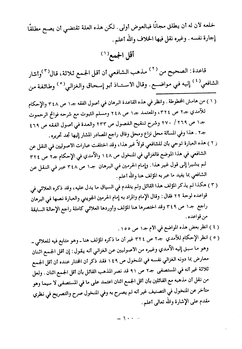 (¬5) انظر الإحكام للآمدي جـ 2 ص 324 غير أن ما ذكره المؤلف هنا -وهو متابع فيه للعلائي- وهو ما سبق إليه الآمدى وغيره من الأصوليين عن الغزالي أنه يقول: إن أقل الجمع اثنان معارض بما دونه الغزالي نفسه في المنخول ص 149 فقد ذكر أن المختار عنده أن أقل الجمع ثلاثة غير أنه في المستصفى جـ 2 ص 91 قد نصر المذهب القائل بأن أقل الجمع اثنان. ولعل من نقل أن مذهبه مع القائلين بأن أقل الجمع اثنان اعتمد على ما في المستصفى لا سيما وهو متأخر عن المنخول في التصنيف غير أنه لم يصرح به وفي المنخول صرح والتصريح في نظري مقدم على الإشارة والله تعالى أعلم.