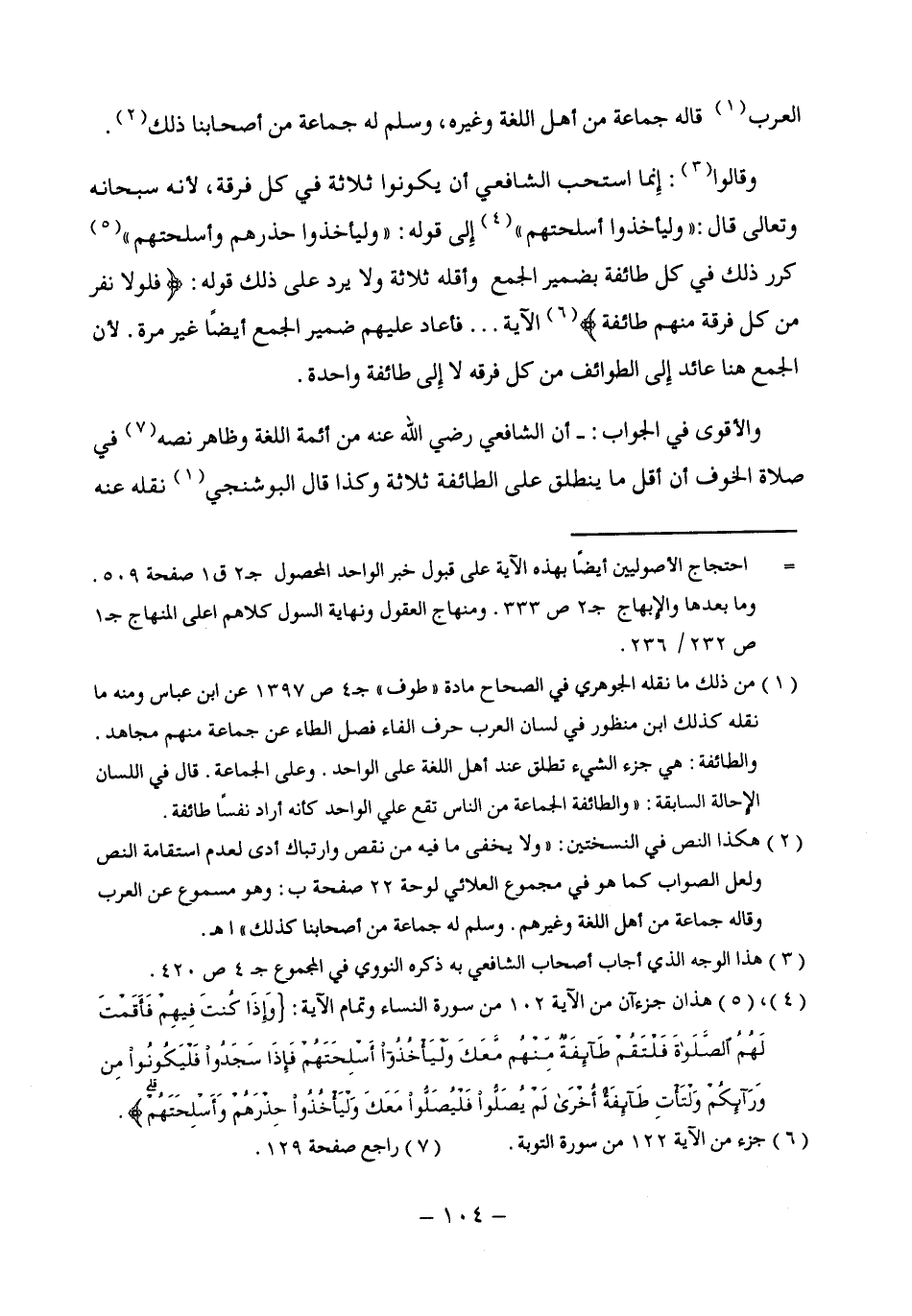 (¬1) من ذلك ما نقله الجوهوي في الصحاح مادة "طوف" جـ 4 ص 1397 عن ابن عباس ومنه ما نقله كذلك ابن منظور في لسان العرب حرف الفاء فصل الطاء عن جماعة منهم مجاهد. والطائفة: هي جزء الشئ تطلق عند أهل اللغة على الواحد. وعلى الجماعة. قال في اللسان الأحالة السابقة: "والطائفة الجماعة من الناس تقع علي الواحد كأنه أراد نفسًا طائفة.