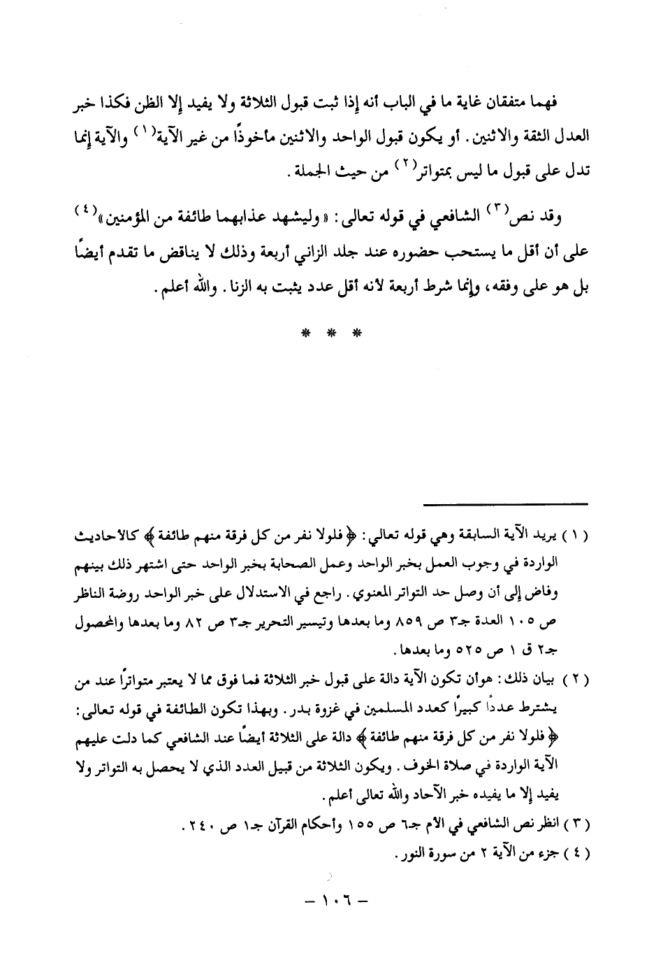 (¬2) بيان ذلك: هو أن تكون الآية دالة على قبول خبر الثلاثة فما فوق مما لا يعتبر متواترًا عند من يشترط عددًا كبيرًا كعدد المسلمبن في غزوة بدر. وبهذا تكون الطائفة في قوله تعالى: {فَلَوْلَا نَفَرَ مِنْ كُلِّ فِرْقَةٍ مِنْهُمْ طَائِفَةٌ} دالة على الثلاثة أيضًا عند الشافعي كما دلت عليهم الآية الواردة في صلاة الخوف. ويكون الثلاثة من قبيل العدد الذى لا يحصل به التواتر ولا يفيد إلا ما يفيده خبر الآحاد والله تعالى أعلم.