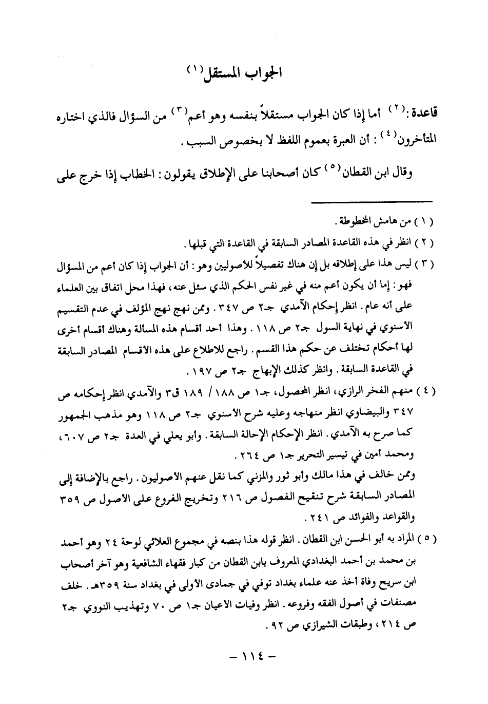 قاعدة: (¬2) أما إِذا كان الجواب مستقلًا بنفسه وهو أعم (¬3) من السؤال فالذى اختاره المتأخرون (¬4): أن العبرة بعموم اللفظ لا بخصوص السبب.