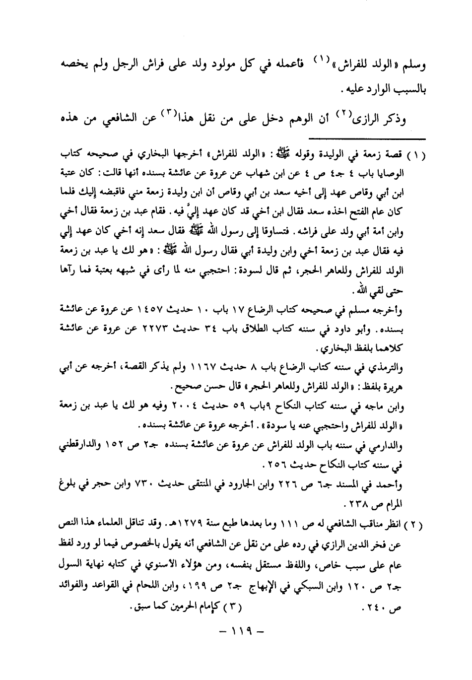 (¬1) قصة زمعة في الوليدة وقوله - صلى الله عليه وسلم -: "الولد للفراش" أخرجها البخارى في صحيحه كتاب الوصايا باب 4 جـ 4 ص 4 عن ابن شهاب عن عروة عن عائشة بسنده أنها قالت: كان عتبة ابن أبي وقاص عهد إِلى أخيه سعد بن أبي وقاص أن ابن وليدة زمعة مني فاقبضه إِليك فلما كان عام الفتح اخذه سعد فقال ابن أخي قد كان عهد إِليَّ فيه. فقام عبد بن زمعة فقال أخي وابن أمة أبي ولد على فراشه. فتساوقا إلى رسول الله - صلى الله عليه وسلم - فقال سعد إِنه أخي كان عهد إِلي فيه فقال عبد بن زمعة أخي وابن وليدة أبي فقال رسول الله - صلى الله عليه وسلم -: "هو لك يا عبد بن زمعة الولد للفراش وللعاهر الحجر، ثم قال لسودة: احتجبي منه لما رأى في شبهه بعتبة فما رآها حتى لقي الله.