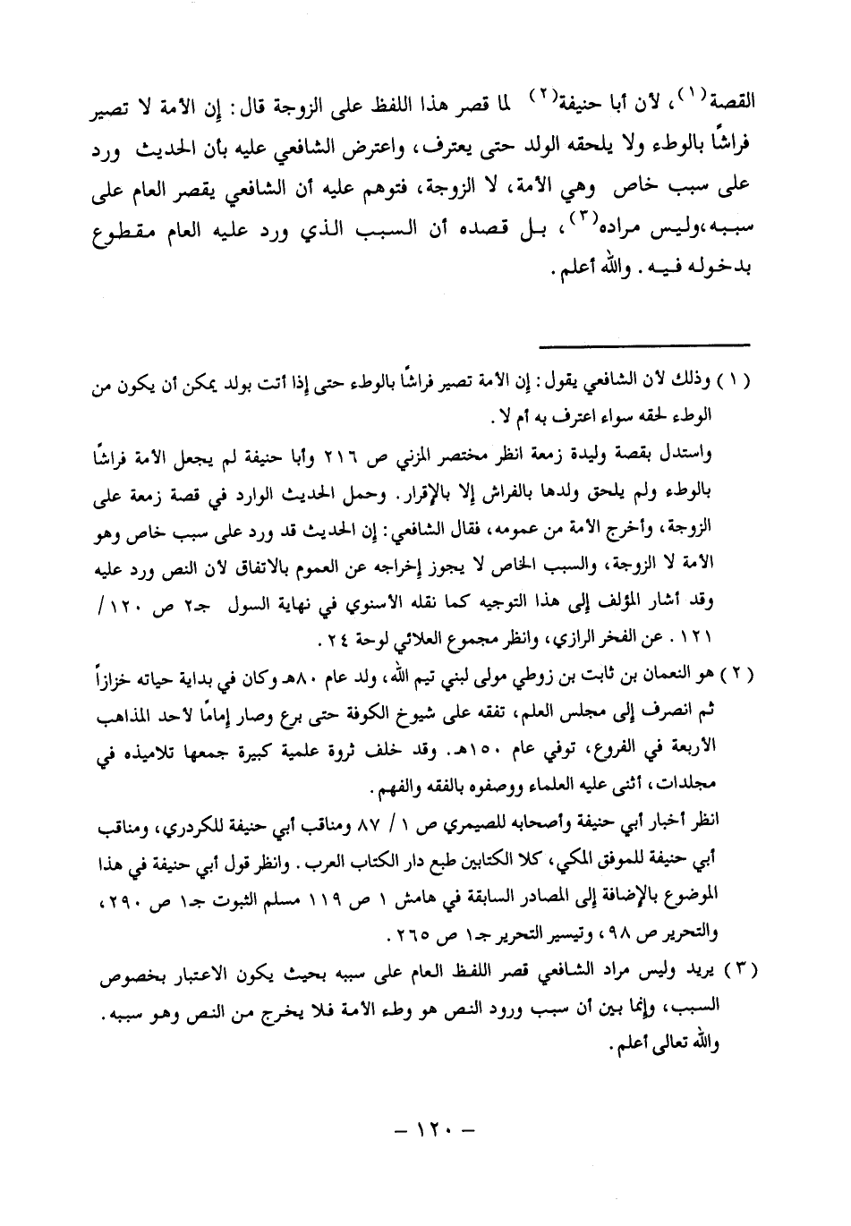 واستدل بقصة وليدة زمعة انظر مختصر المزني ص 216 وأبا حنيفة لم يجعل الأمة فراشًا بالوطء ولم يلحق ولدها بالفراش إِلا بالإقرار. وحمل الحديث الوارد في قصة زمعة على الزوجة، وأخرج الأمة من عمومه، فقال الشافعي: إِن الحديث قد ورد على سبب خاص وهو الأمة لا الزوجة، والسبب الخاص لا يجوز إِخراجه عن العموم بالاتفاق لأن النص ورد عليه وقد أشار المؤلف إلى هذا التوجيه كما نقله الأسنوي في نهاية السول جـ 2 ص 120/ 121. عن الفخر الرازي، وانظر مجموع العلائي لوحة 24.