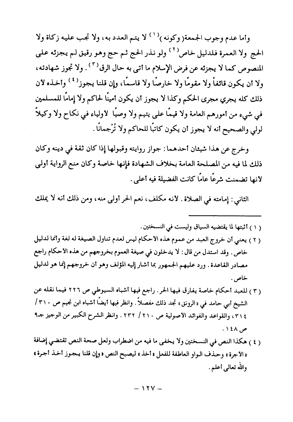 (¬3) للعبد أحكام خاصة يفارق فيها الحر. راجع فيها أشباه السيوطي ص 226 فيما نقله عن الشيخ أبي حامد في "الرونق" تجد ذلك مفصلًا. وانظر فيها أيضًا أشباه ابن نجيم ص 310/ 314، والقواعد والفوائد الأصولية ص 210/ 232. وانظر الشرح الكبير من الوجيز جـ 9 ص 148.