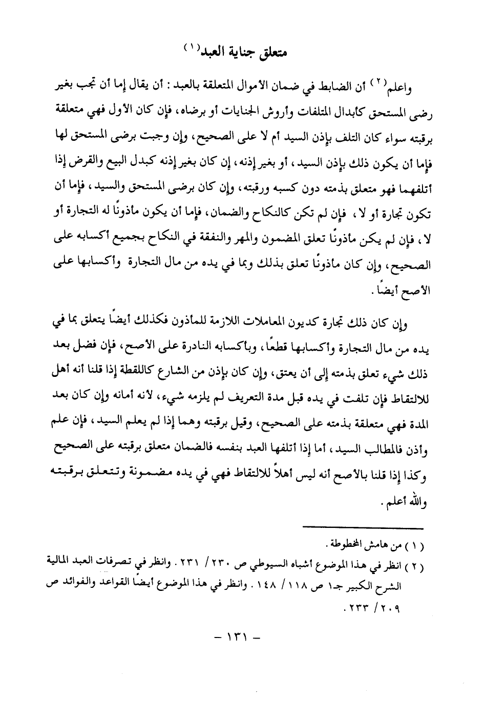 (¬2) انظر في هذا الموضوع أشباه السيوطي ص 230/ 231. وانظر في تصرفات العبد المالية الشرح الكبير جـ 1 ص 118/ 148. وانظر في هذا الموضوع أيضًا القواعد والفوائد ص 209/ 233.