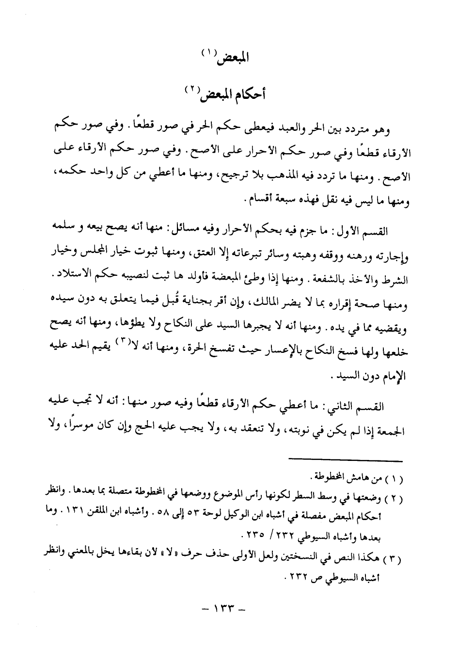 (¬2) وضعتها في وسط السطر لكونها رأس الموضوع ووضعها في المخطوطة متصلة بما بعدها. وانظر أحكام المبعض مفصلة في أشباه ابن الوكيل لوحة 53 إِلى 58. وأشباه ابن الملقن 131. وما بعدها وأشباه السيوطي 232/ 235.
