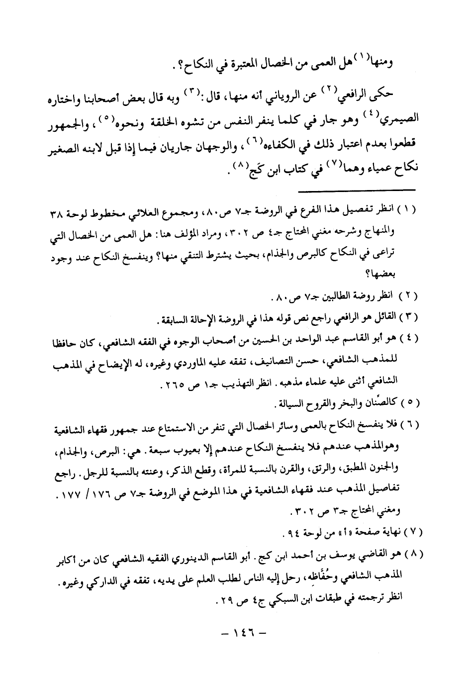 (¬1) انظر تفصيل هذا الفرع في الروضة ج 7 ص 80، ومجموع العلائي مخطوط لوحة 38 والمنهاج وشرحه مغني المحتاج ج 4 ص 302، ومراد المؤلف هنا: هل العمى من الخصال التي تراعى في النكاح كالبرص والجذام، بحيث يشترط التنقي منها؟ وينفسخ النكاح عند وجود بعضها؟