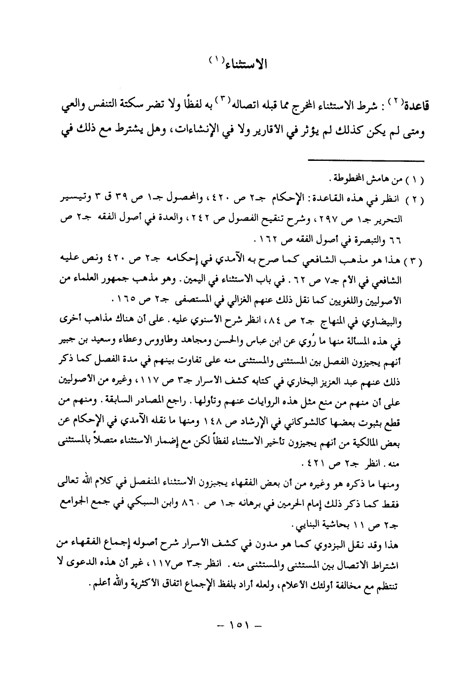 والبيضاوي في المنهاج جـ 2 ص 84، انظر شرح الأسنوي عليه. على أن هناك مذاهب أخرى في هذه المسألة منها ما رُوى عن ابن عباس والحسن ومجاهد وطاووس وعطاء وسعيد بن جبير أنهم يجيزون الفصل بين المستثنى والمستثنى منه على تفاوت بينهم في مدة الفصل كما ذكر ذلك عنهم عبد العزيز البخارى في كتابه كشف الأسرار جـ 3 ص 117، وغيره من الأصوليين على أن منهم من منع مثل هذه الروايات عنهم وتأولها. راجع المصادر السابقة. ومنهم من قطع بثبوت بعضها كالشوكاني في الإرشاد ص 148 ومنها ما نقله الآمدي في الإحكام عن بعض المالكية من أنهم يجيزون تأخير الاستثناء لفظًا لكن مع إضمار الاستثناء متصلًا بالمستثنى منه. انظر جـ 2 ص 421.