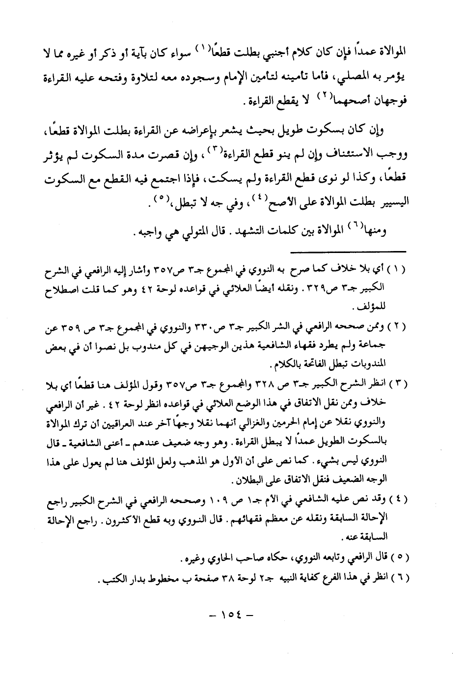 (¬2) وممن صححه الرافعي في الشرح الكبير جـ 3 ص 330 والنووي في المجموع جـ 3 ص 359 عن جماعة ولم يطرد فقهاء الشافعية هذين الوجيهن في كل مندوب بل نصوا أن في بعض المندوبات تبطل الفاتحة بالكلام.