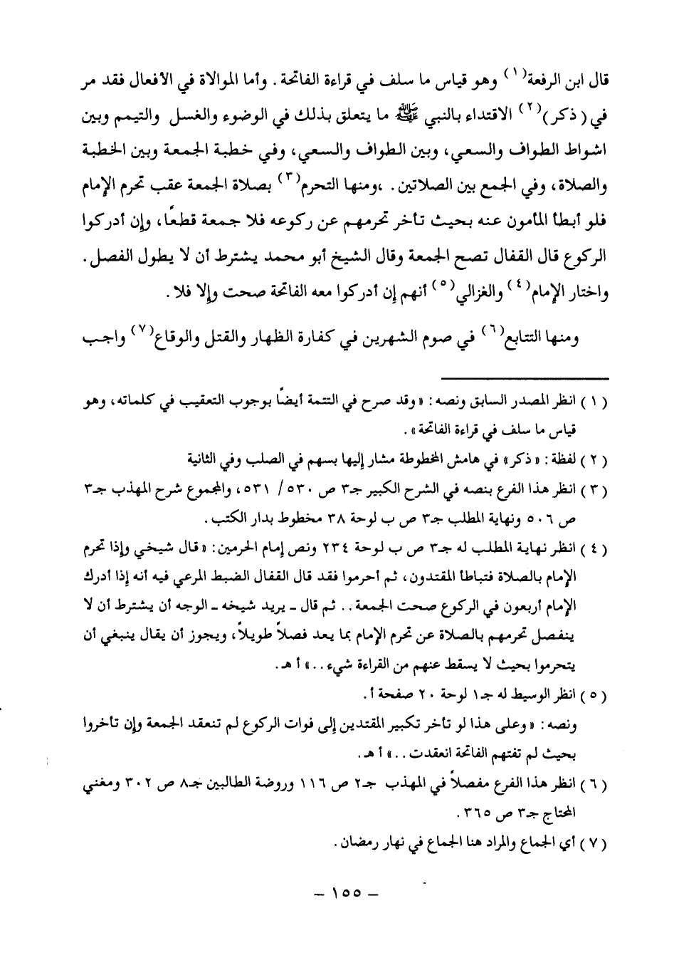 (¬4) انظر نهاية المطلب له ج 3 ص ب لوحة 234 ونص إمام الحرمين: "قال شيخي وإذا تحرم الإِمام بالصلاة فتباطأ المقتدون، ثم أحرموا فقد قال القفال الضبط المرعي فيه أنه إِذا أدرك الإِمام أربعون في الركوع صحت الجمحة .. ثم قال - يريد شيخه - الوجه أن يشترط أن لا ينفصل تحرمهم بالصلاة عن تحرم الإِمام بما يعد فصلًا طويلًا، ويجوز أن يقال ينبغي أن يتحرموا بحيث لا يسقط عنهم من القراءة شيء .. " أهـ.