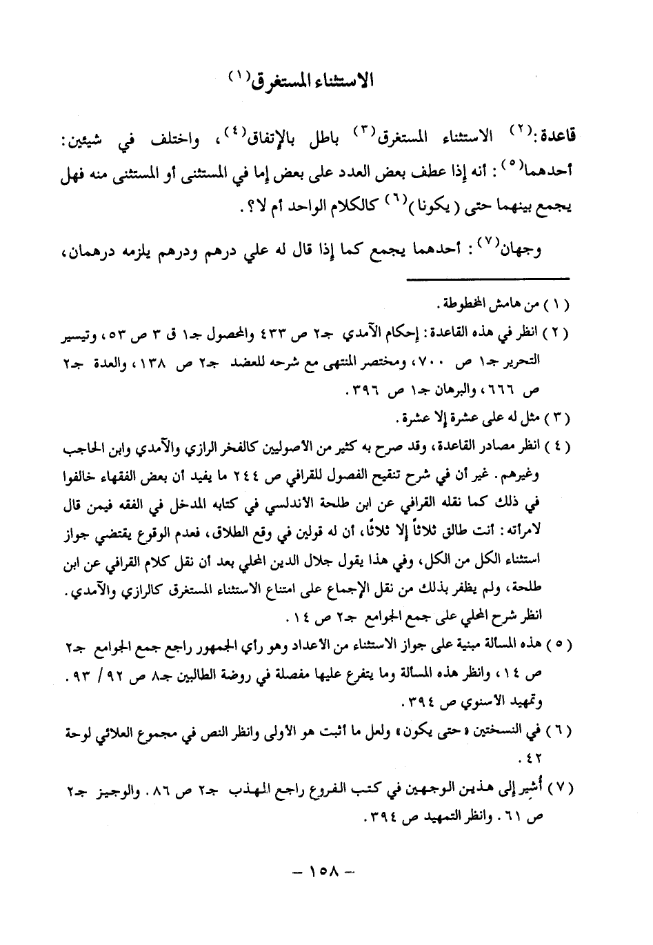 (¬4) انظر مصادر القاعدة، وقد صرح به كثير من الأصوليين كالفخر الرازى والآمدى وابن الحاجب وغيرهم. غير أن في شرح تنقيح الفصول للقرافي ص 244 ما يفيد أن بعض الفقهاء خالفوا في ذلك كما نقله القرافي عن ابن طلحة الأندلسي في كتابه المدخل في الفقه فيمن قال لامرأته: أنت طالق ثلاثًا إِلا ثلاثًا، أن له قولين في وقع الطلاق، فعدم الوقوع يقتضي جواز استثناء الكل من الكل، وفي هذا يقول جلال الدين المحلي بعد أن نقل كلام القرافي عن ابن طلحة، ولم يظفر بذلك من نقل الإجماع على امتناع الاستثناء المستغرق كالرازى والآمدى. انظر شرح المحلي على جمع الجوامع جـ 2 ص 14.