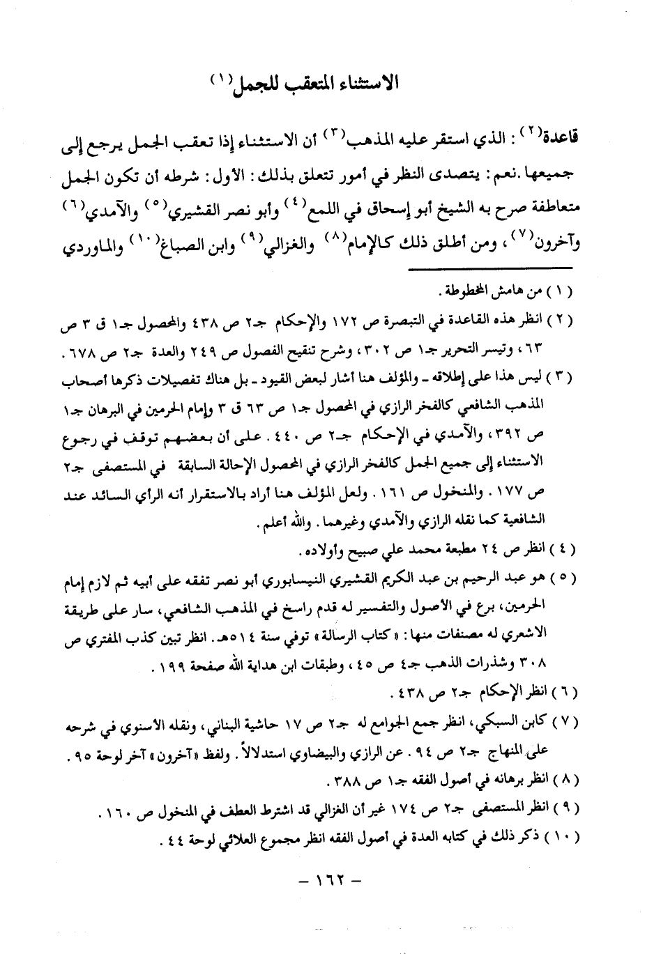 (¬3) ليس هذا على إطلاقه - والمؤلف هنا أشار لبعض القيود - بل هناك تفصيلات ذكرها أصحاب المذهب الشافعي كالفخر الرازي في المحصول ج 1 ص 63 ق 3 وإمام الحرمين في البرهان ج 1 ص 392، والآمدي في الإحكام ج 2 ص 440. على أن بعضهم توقف في رجوع الاستثناء إِلى جميع الجمل كالفخر الرازي في المحصول الإِحالة السابقة في المستصفى ج 2 ص 177. والمنخول ص 161. ولعل المؤلف هنا أراد بالإستقرار أنه الرأي السائد عند الشافعية كما نقله الرازي والآمدي وغيرهما. والله أعلم.