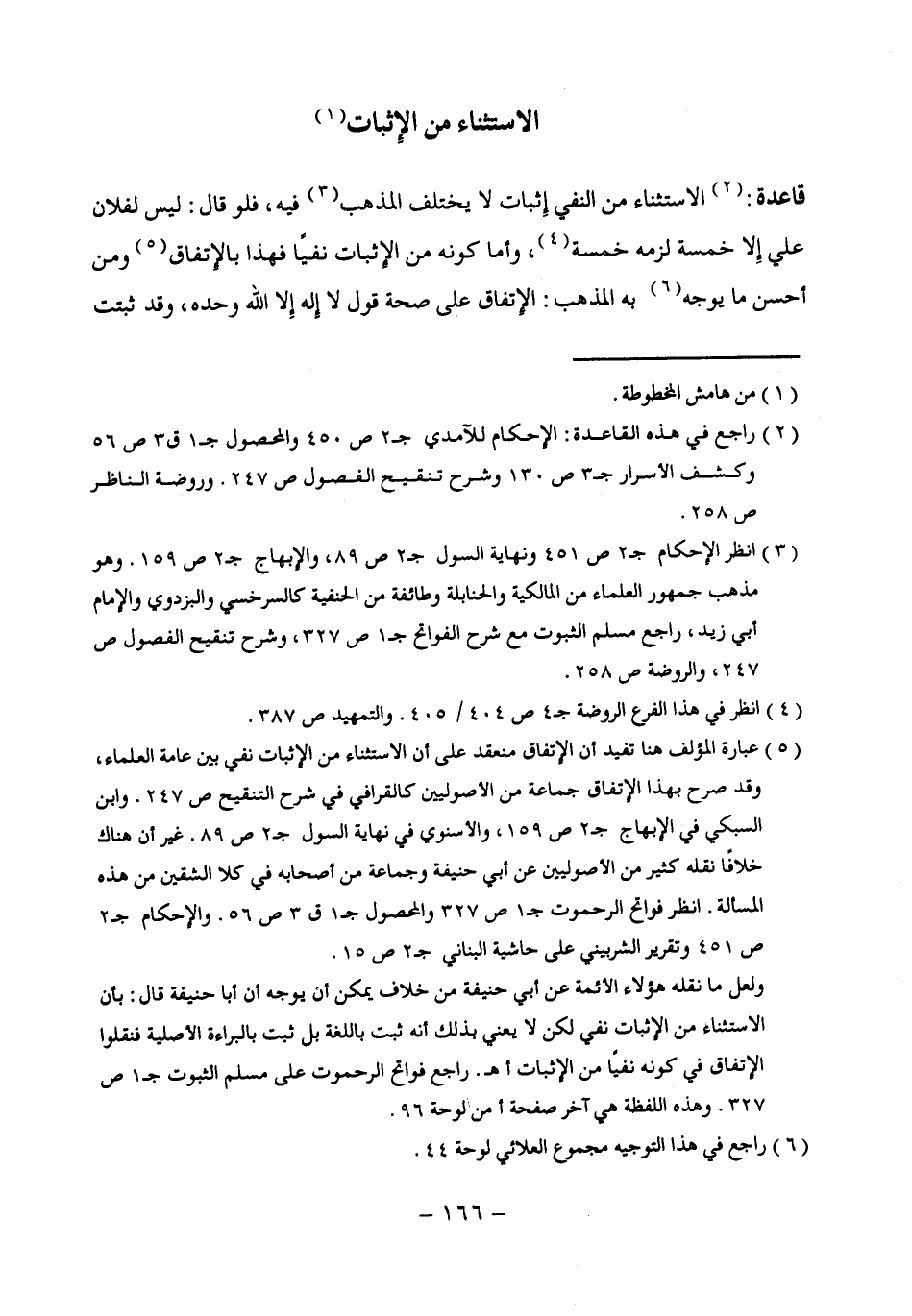 ولعل ما نقله هؤلاء الأئمة عن أبي حنيفة من خلاف يمكن أن يوجه أن أبا حنيفة قال: بأن الاستثناء من الإِثبات نفي لكن لا يعني ذلك أنه ثبت باللغة بل ثبت بالبراءة الأصلية فنقلوا الإِتفاق في كونه نفيًا من الإثبات أهـ. راجع فواتح الرحموت على مسلم الثبوت جـ 1 ص 327. وهذه اللفظة هي آخر صفحة أمن لوحة 96.