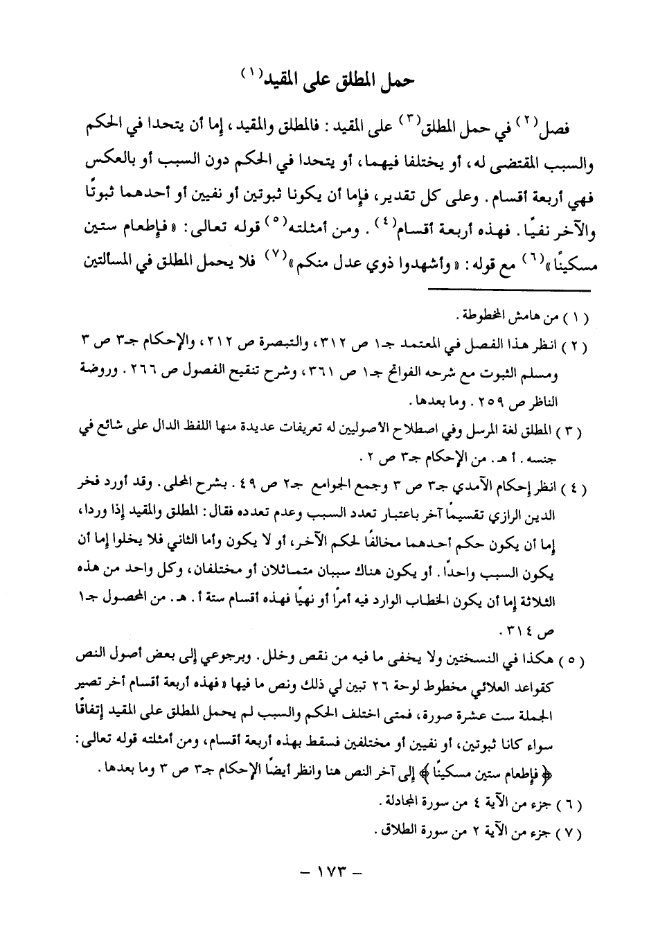 (¬5) هكذا في النسختين ولا يخفى ما فيه من نقص وخلل. وبرجوعي إِلى بعض أصول النص كقواعد العلائي مخطوط لوحة 26 تبين لي ذلك ونص ما فيها " فهذه أربعة أقسام أخر تصير الجملة ست عشرة صورة، فمتى اختلف الحكم والسبب لم يحمل المطلق على المقيد إِتفاقًا سواء كانا ثبوتين، أو نفيين أو مختلفين فسقط بهذه أربعة أقسام، ومن أمثلته قوله تعالى: {فَإِطْعَامُ سِتِّينَ مِسْكِينًا} إِلى آخر النص هنا وانظر أيضًا الإحكام ج 3 ص 3 وما بعدها.