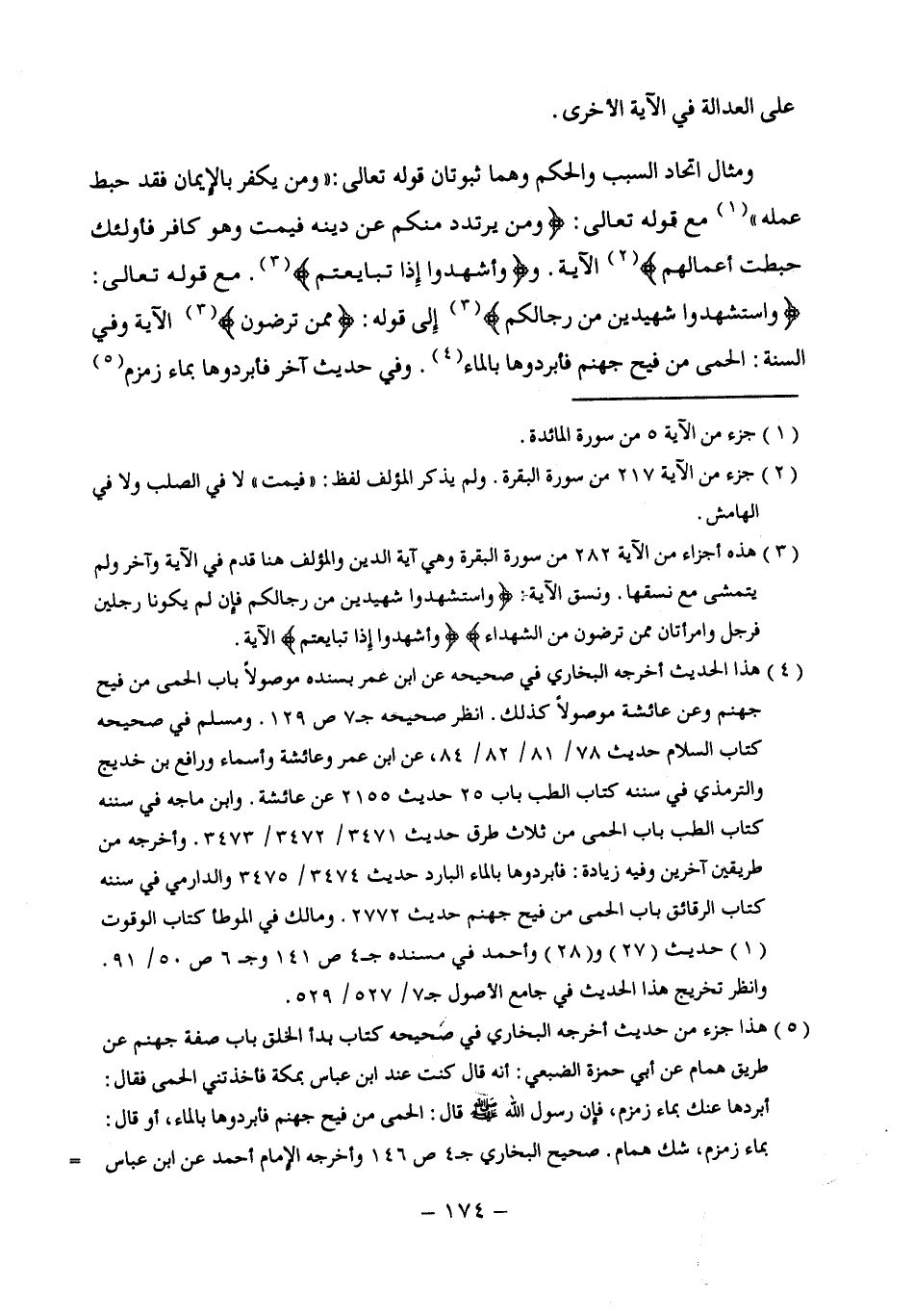 ومثال اتحاد السبب والحكم وهما ثبوتان قوله تعالى: " {وَمَنْ يَكْفُرْ بِالْإِيمَانِ فَقَدْ حَبِطَ عَمَلُهُ} (¬1) مع قوله تعالى: {وَمَنْ يَرْتَدِدْ مِنْكُمْ عَنْ دِينِهِ فَيَمُتْ وَهُوَ كَافِرٌ فَأُولَئِكَ حَبِطَتْ أَعْمَالُهُمْ} (¬2) الآية. و {وَأَشْهِدُوا إِذَا تَبَايَعْتُمْ} (3). مع قوله تعالى: {وَاسْتَشْهِدُوا شَهِيدَيْنِ مِنْ رِجَالِكُمْ} (3) إِلى قوله: {مِمَّنْ تَرْضَوْنَ} (¬3) الآية وفي السنة: الحمى من فيح جهنم فأبردوها بالماء (¬4). وفي حديث آخر فأبردوها بماء زمزم (¬5)
