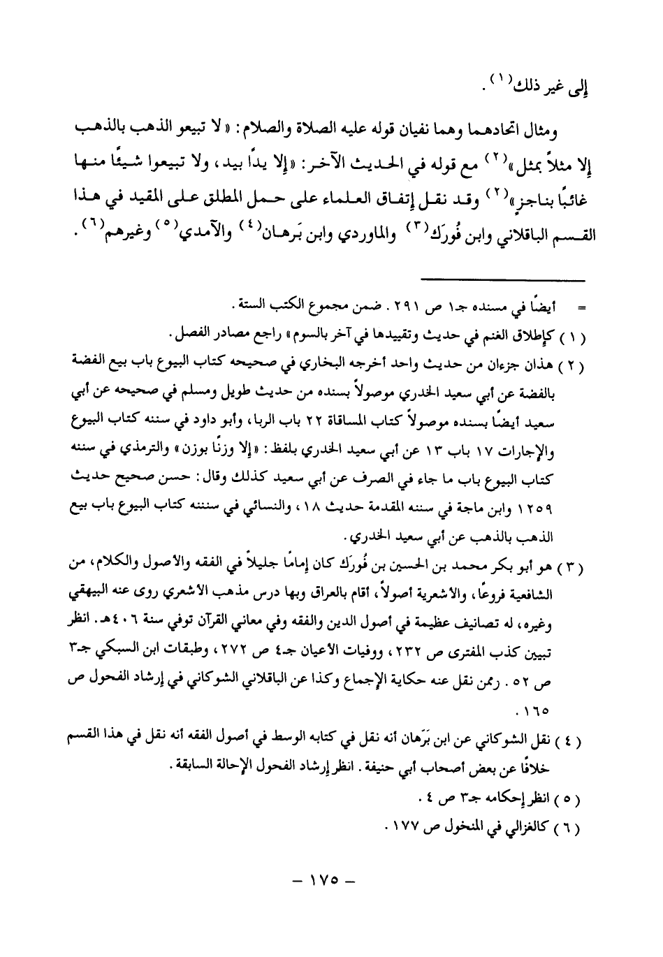 (¬4) نقل الشوكاني عن ابن بَرَهان أنه نقل في كتابه الوسط في أصول الفقه أنه نقل في هذا القسم خلافا عن بعض أصحاب أبي حنيفة. انظر إِرشاد الفحول الإِحالة السابقة.