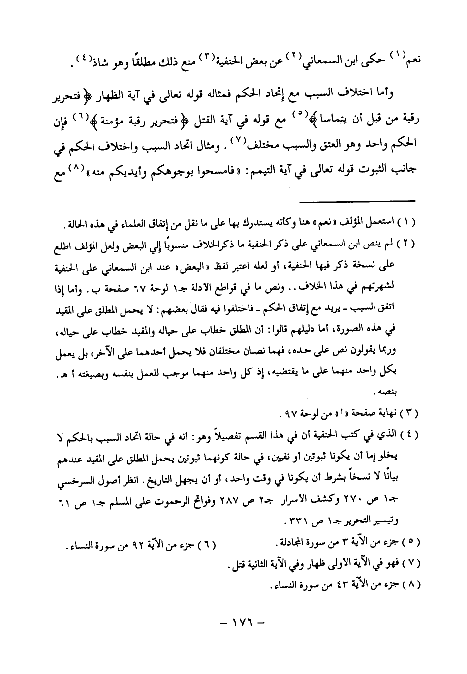(¬2) لم ينص ابن السمعاني على ذكر الحنفية ما ذكر الخلاف منسوبًا إلى البعض ولعل المؤلف اطلع على نسخة ذكر فيها الحنفية، أو لعله اعتبر لفظ "البعض" عند ابن السمعاني على الحنفية لشهرتهم في هذا الخلاف .. ونص ما في قواطع الأدلة ص 1 لوحة 67 صفحة ب. وأما إِذا اتفق السبب - يريد مع إِتفاق الحكم - فاختلفوا فيه فقال بعضهم: لا يحمل المطلق على المقيد في هذه الصورة، أما دليلهم قالوا: أن المطلق خطاب على حياله والمقيد خطاب على حياله، وربما يقولون نص على حده، فهما نصان مختلفان فلا يحمل أحدهما على الآخر، بل يعمل لكل واحد منهما على ما يقتضيه، إِذ كل واحد منهما موجب للعمل بنفسه وبصيغته أهـ. بنصه.