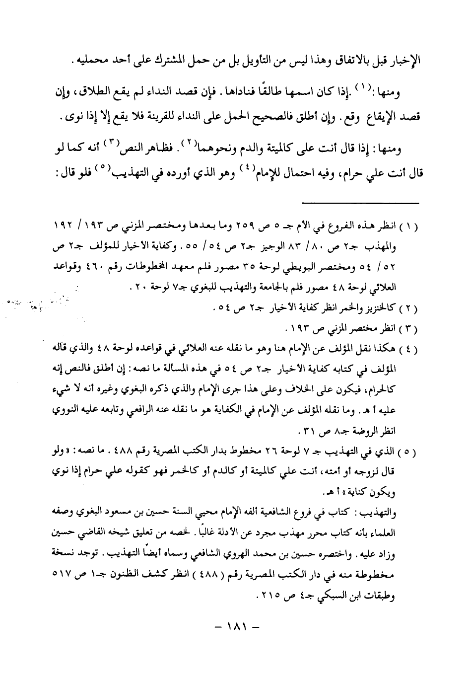(¬5) الذى في التهذيب جـ 7 لوحة 26 مخطوط بدار الكتب المصرية رقم 488. ما نصه: "ولو قال لزوجه أو أمته، أنت على كالميتة أو كالدم أو كالخمر فهو كقوله على حرام إِذا نوى ويكون كناية" أهـ.