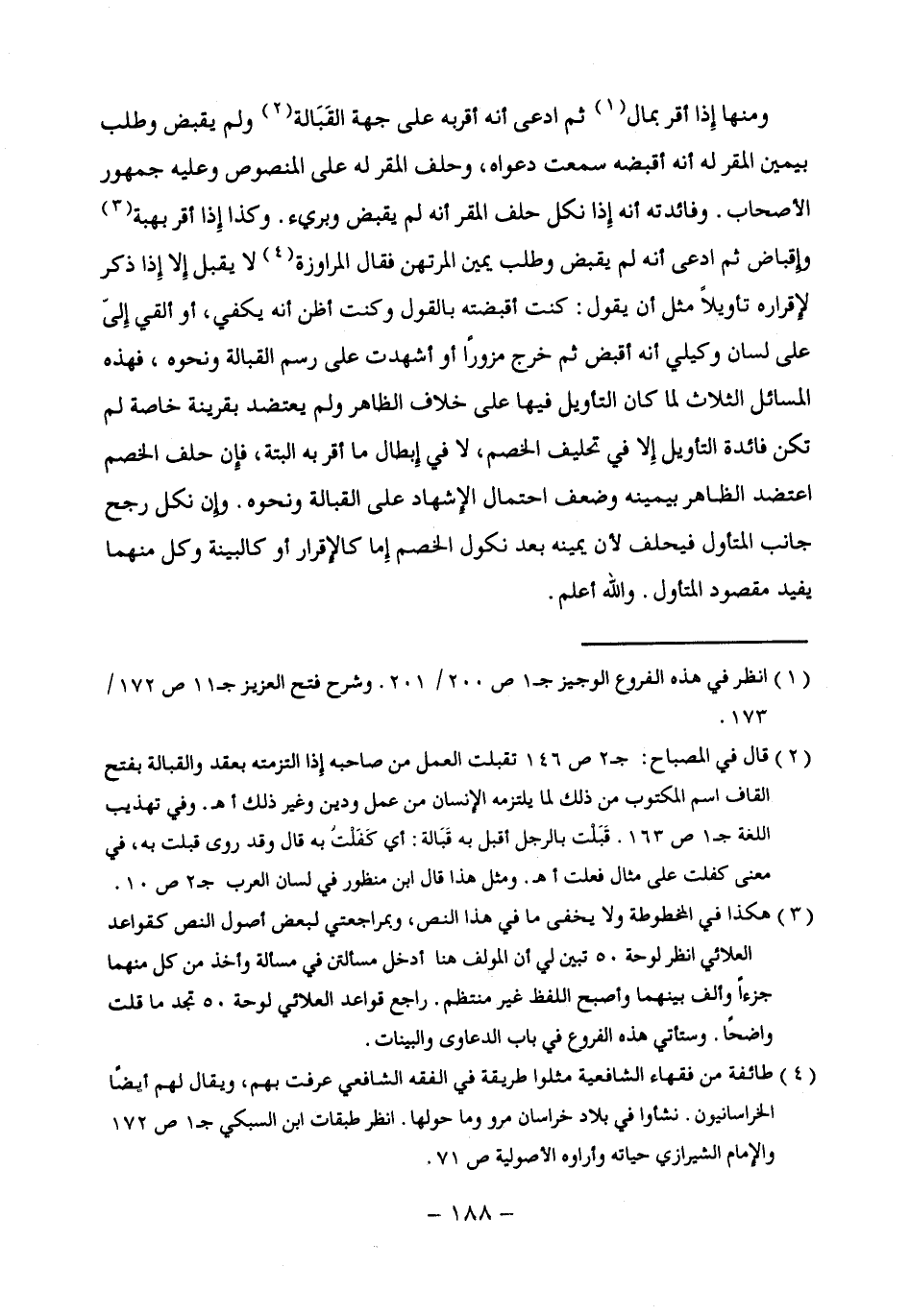 (¬3) هكذا في المخطوطة ولا يخفى ما في هذا النص، وبمراجعتي لبعض أصول النص كقواعد العلائي انظر لوحة 50 تبين لي أن المؤلف هنا أدخل مسألتين في مسألة وأخذ من كل منهما جزءًا وألف بينهما وأصبح اللفظ غير منتظم. راجع قواعد العلائي لوحة 50 تجد ما قلت واضحًا. وستأتي هذه الفروع في باب الدعاوى والبينات.