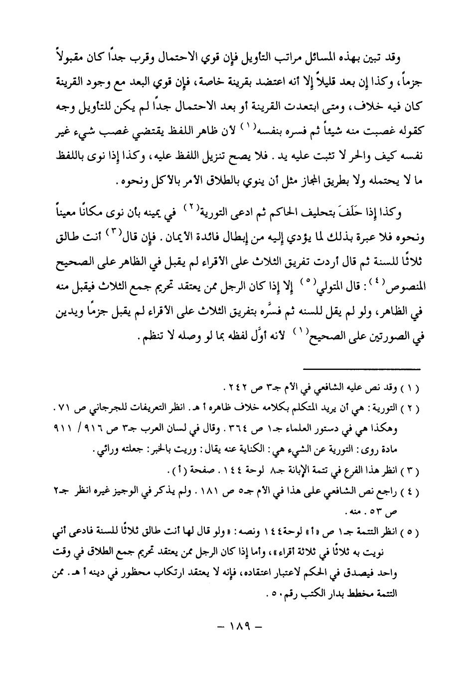 (¬5) انظر التتمة ج 1 ص "أ" لوحة 144 ونصه: "ولو قال لها أنت طالق ثلاثًا للسنة فادعى أني نويت به ثلاثًا في ثلاثة أقراء"، وأما إِذا كان الرجل ممن يعتقد تحريم جمع الطلاق في وقت واحد فيصدق في الحكم لاعتبار اعتقاده، فإِنه لا يعتقد ارتكاب محظور في دينه أهـ. ممن التتمة مخطط بدار الكتب رقم 50.