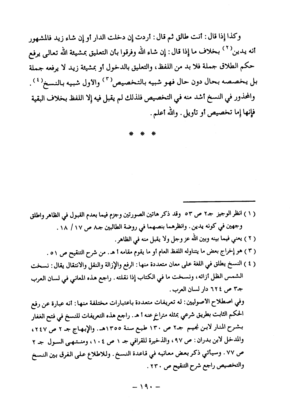 وفي اصطلاح الأصوليين: له تعريفات متعددة باعتبارات مختلفة منها: أنه عبارة عن رفع الحكم الثابت بطريق شرعي بمثله متراخٍ عنه أهـ. راجع هذه التعريفات للنسخ في فتح الغفار بشرح المنار لابن نجيم ج 2 ص 130 طبع سنة 1355 هـ. والإبهاج ج 2 ص 247، والمدخل لابن بدران: ص 97، والذخيرة للقرافي ج 1 ص 104، ومنتهى السول ص 2 ص 77. وسيأتي ذكر بعض معانيه في قاعدة النسخ. وللاطلاع على الفرق بين النسخ والتخصيص راجع شرح التنقيح ص 230.