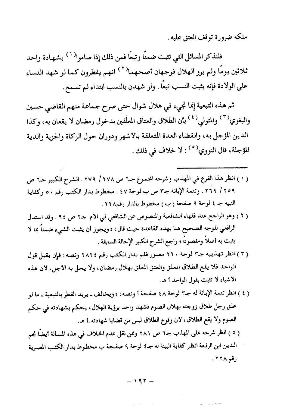 (¬4) انظر تتمة الإِبانة له جـ 3 لوحة 48 صفحة أونصه: "ويخالف - يريد الفطر بالتبعية - ما لو علق رجل طلاق زوجته بهلال الصوم فشهد واحد برؤية الهلال، يحكم بشهادته في حكم الصوم ولا يقع الطلاق، لأن وقوع الطلاق ليس من قضايا شهادته. أهـ.