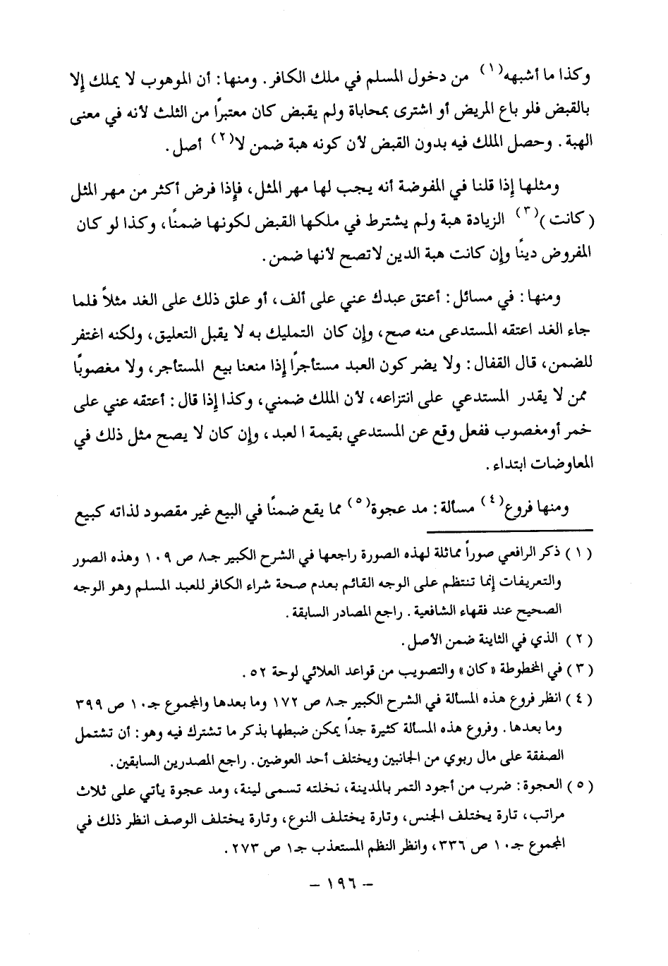 (¬4) انظر فروع هذه المسألة في الشرح الكبير جـ 8 ص 172 وما بعدها والمجموع ج 10 ص 399 وما بعدها. وفروع هذه المسألة كثيرة جدًّا يمكن ضبطها بذكر ما تشترك فيه وهو: أن تشتمل الصفقة على مال ربوي من الجانبين ويختلف أحد العوضين. راجع المصدرين السابقين.