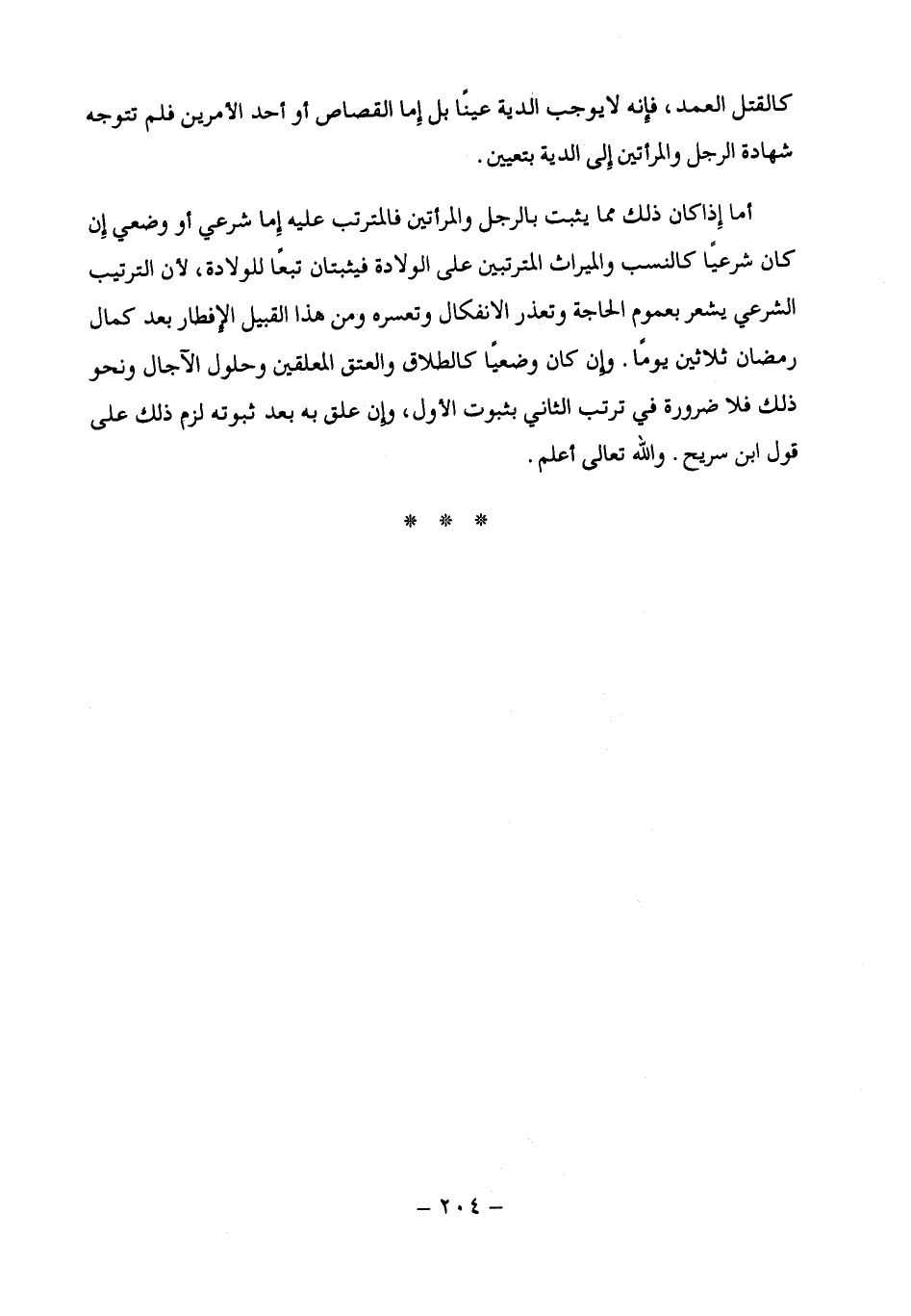 أما إِذا كان ذلك مما يثبت بالرجل والمرأتين فالمترتب عليه إِما شرعي أو وضعي إِن كان شرعيًا كالنسب والميراث المترتبين على الولادة فيثبتان تبعًا للولادة، لأن الترتيب الشرير يشعر بعموم الحاجة وتعذر الانفكال وتعسره ومن هذا القبيل الإفطار بعد كمال رمضان ثلاثين يومًا. وإن كان وضعيًا كالطلاق والعتق المعلقين وحلول الآجال ونحو ذلك فلا ضرورة في ترتب الثاني بثبوت الأول، وإِن علق به بعد ثبوته لزم ذلك على قول ابن سريح. والله تعالى أعلم.