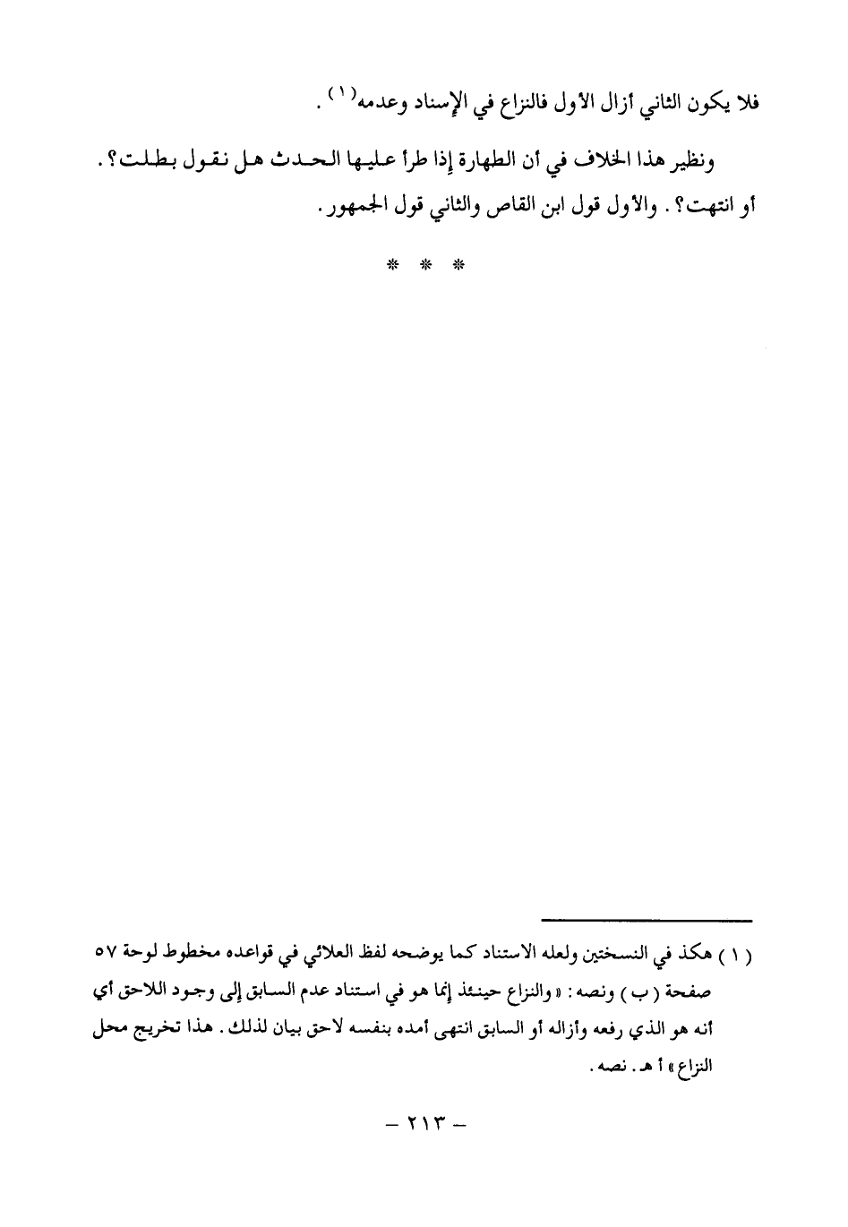 (¬1) هكذ في النسختين ولعله الاستناد كما يوضحه لفظ العلائي في قواعده مخطوط لوحة 57 صفحة (ب) ونصه: "والنزاع حينئذ إِنما هو في استناد عدم السابق إِلى وجود اللاحق أى أنه هو الذى رفعه وأزاله أو السابق انتهى أمده بنفسه لاحق بيان لذلك. هذا تخريج محل النزاع" أهـ. نصه.