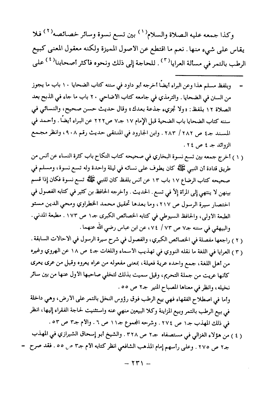 (¬1) أخرج جمعه بين تسع نسوة البخارى في صحيحه كتاب النكاح باب كثرة النساء عن أنس من طريق قتادة أن النبي - صلى الله عليه وسلم - كان يطوف على نسائه في ليلة واحدة وله تسع نسوة، ومسلم في صحيحه كتاب الرضاع 17 باب 13 عن أنس بلفظ كان للنبي - صلى الله عليه وسلم - تسع نسوة فكان إِذا قسم بينهن لا ينتهي إِلى المرأة إِلَّا في تسع. الحديث. وأخرجه الحافظ بن كثير في كتابه الفصول في اختصار سيرة الرسول ص 217، وما بعدها تحقيق محمد الخطراوى ومحي الدين مستو الطبعة الأولى، والحافظ السيوطي في كتابه الخصائص الكبرى جـ 1 ص 173. مطبعة المدني. والبيهقى في سننه جـ 7 ص 73/ 74، عن ابن عباس رضي الله عنهما.
