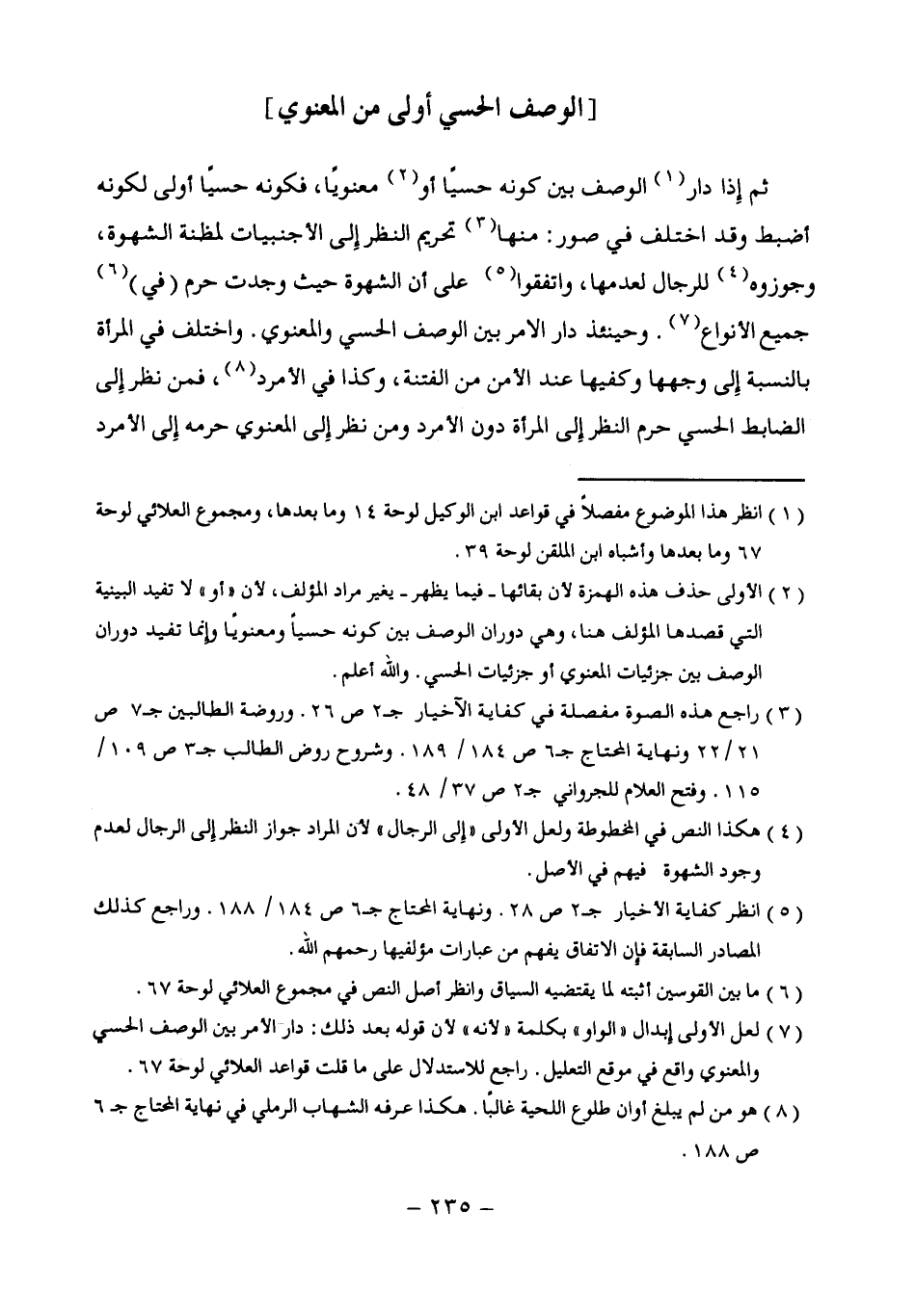 (¬7) لعل الأولى إبدال "الواو" بكلمة "لأنه" لأن قوله بعد ذلك: دار الأمر بين الوصف الحسي والمعنوى واقع في موقع التعليل. راجع للاستدلال على ما قلت قواعد العلائي لوحة 67.