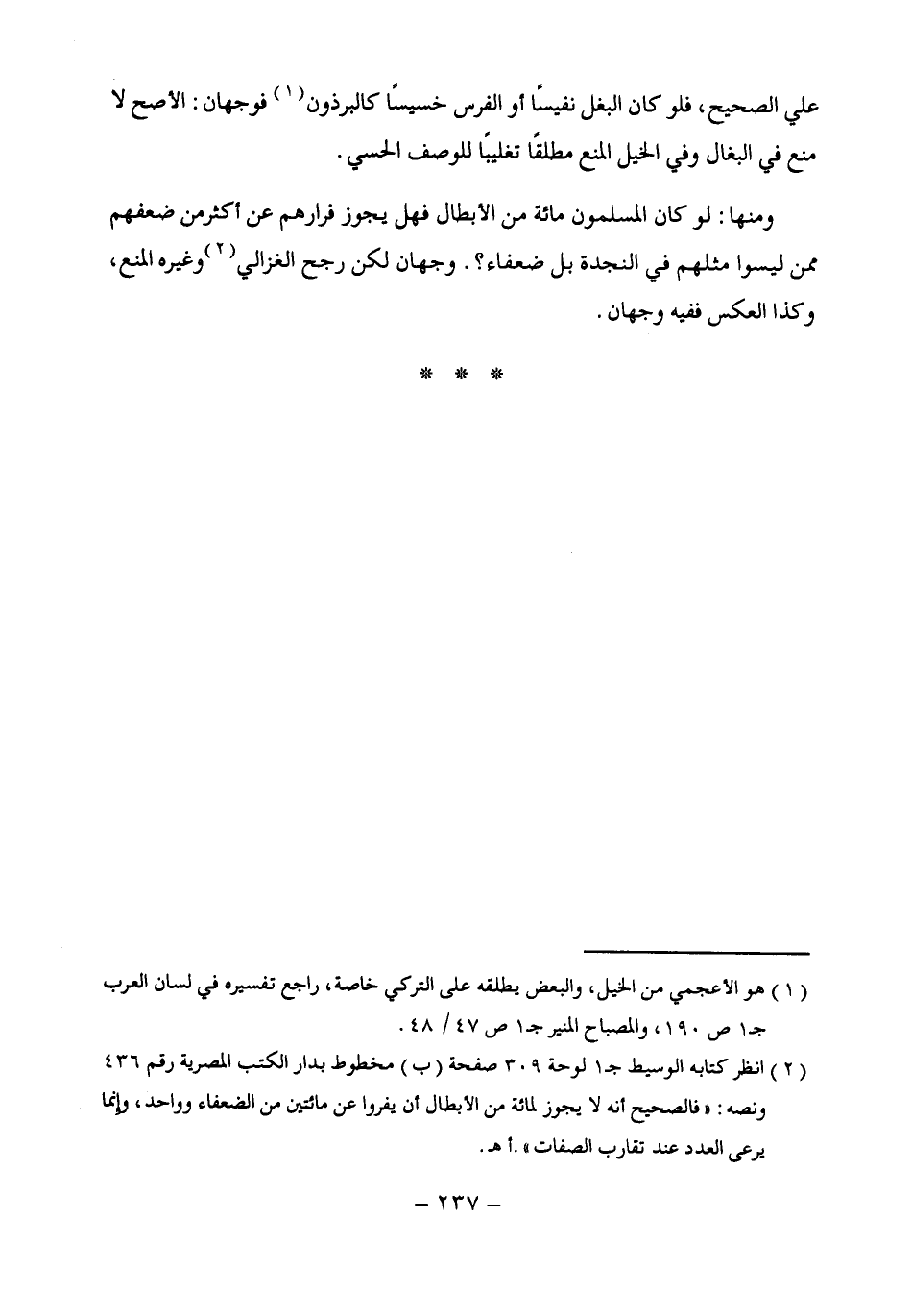 (¬2) انظر كتابه الوسيط جـ 1 لوحة 309 صفحة (ب) مخطوط بدار الكتب المصرية رقم 436 ونصه: "فالصحيح أنه لا يجوز لمائة من الأبطال أن يفروا عن مائتين من الضعفاء وواحد، وإنما يرعى العدد عند تقارب الصفات". أهـ.