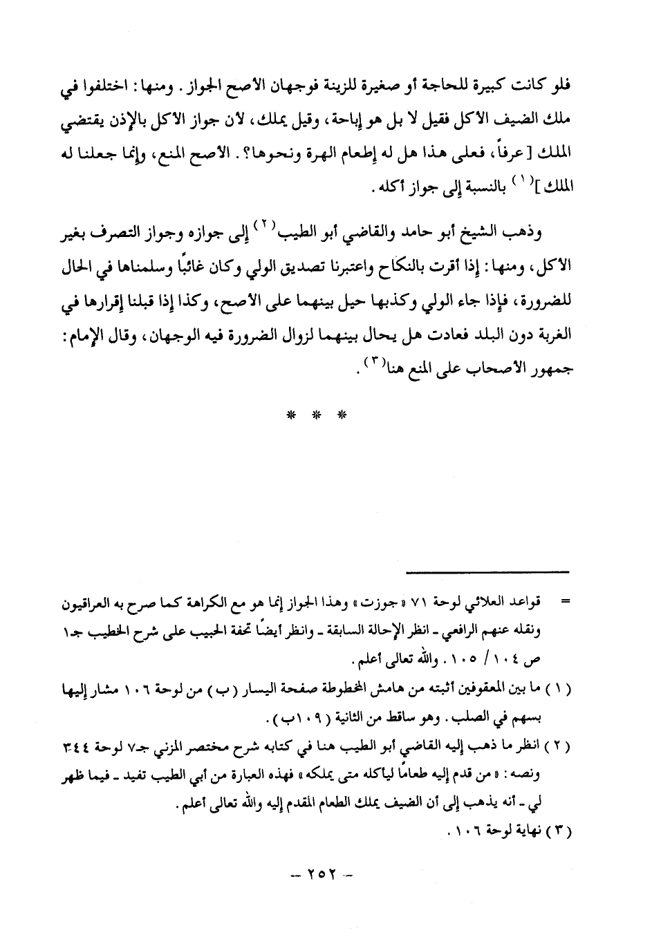 (¬2) انظر ما ذهب إِليه القاضي أبو الطيب هنا في كتابه شرح مختصر المزني جـ 7 لوحة 344 ونصه: "من قدم إِليه طعامًا ليأكله متى يملكه" فهذه العبارة من أبي الطيب تفيد -فيما ظهر لي- أنه يذهب إِلى أن الضيف يملك الطعام المقدم إِليه والله تعالى أعلم.