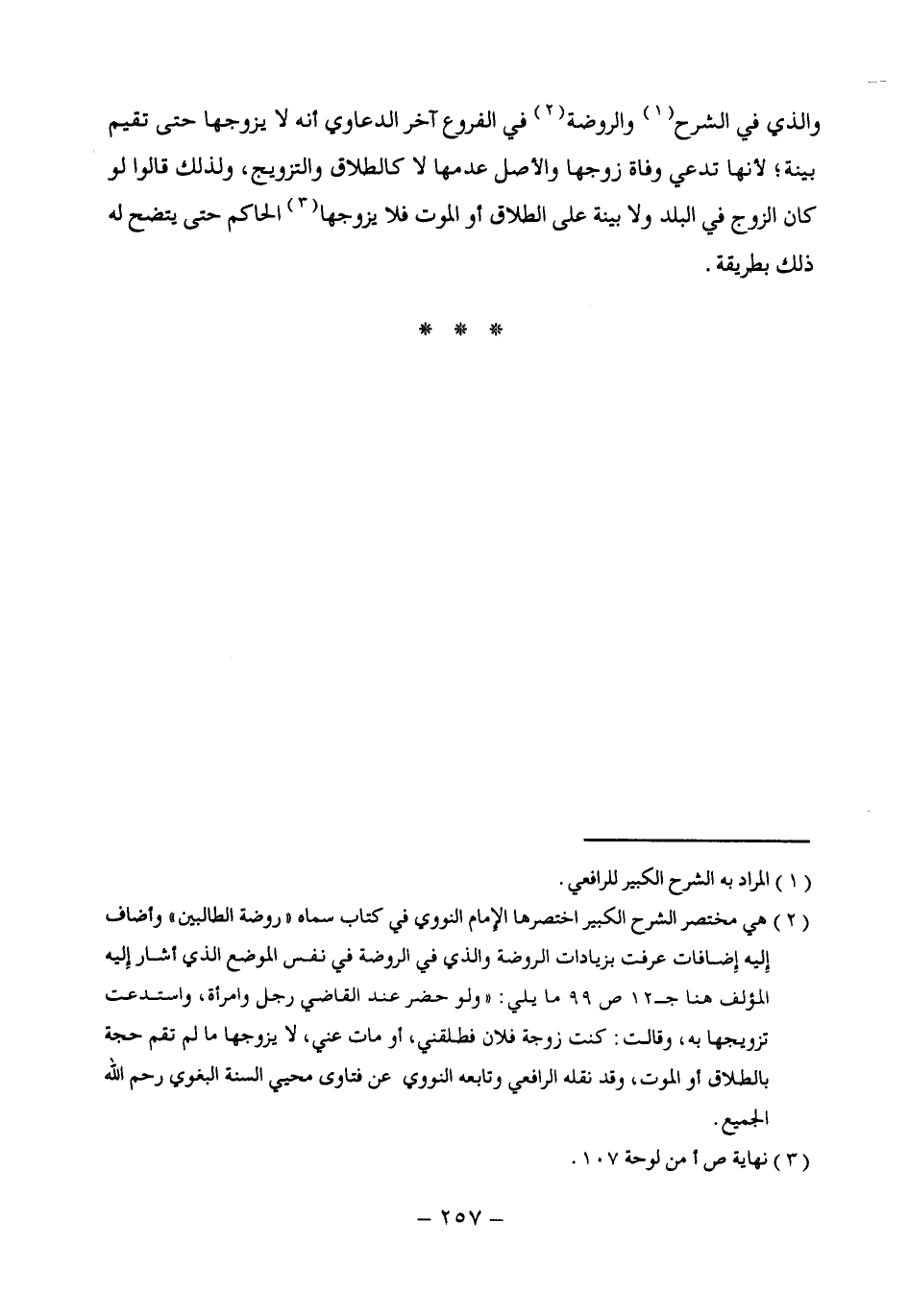 (¬2) هي مختصر الشرح الكبير اختصرها الإمام النووى في كتاب سماه "روضة الطالبين" وأضاف إليه إضافات عرفت بزيادات الروضة والذى في الروضة في نفس الموضع الذى أشار إِليه المؤلف هنا جـ 12 ص 69 ما يلي: "ولو حضر عند القاضي رجل وامرأة، واستدعت تزويجها به، وقالت: كنت زوجة فلان فطلقني، أو مات عني، لا يزوجها ما لم تقم حجة بالطلاق أو الموت، وقد نقله الرافعي وتابعه النووى عن فتاوى محيي السنة البغوى رحم الله الجميع.