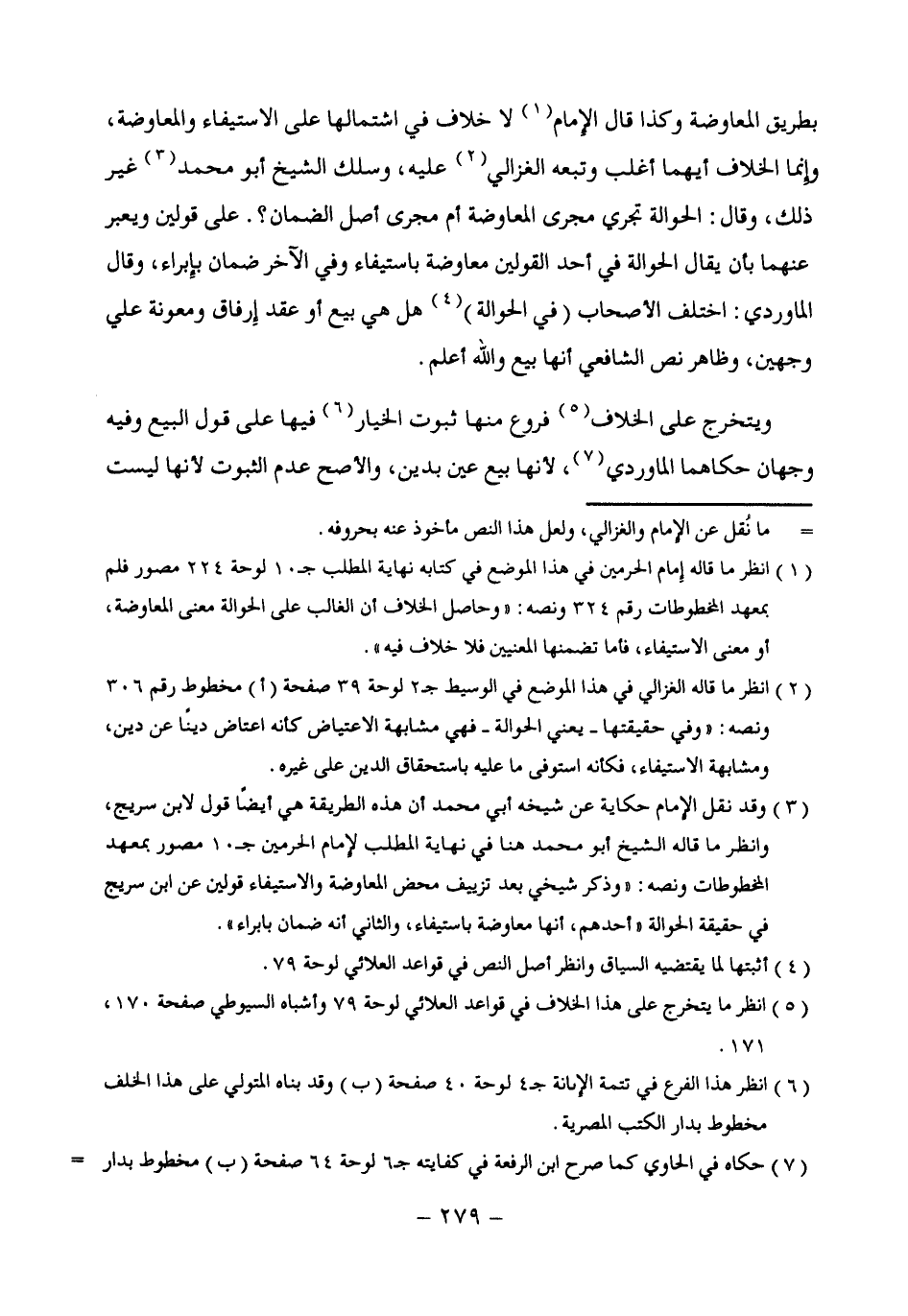 (¬1) انظر ما قاله إمام الحرمين في هذا الموضع في كتابه نهاية المطلب جـ 10 لوحة 224 مصور فلم بمعهد المخطوطات رقم 324 ونصه: "وحاصل الخلاف أن الغالب على الحوالة معنى المعاوضة، أو معنى الاستيفاء، فأما تضمنها المعنيين فلا خلاف فيه".