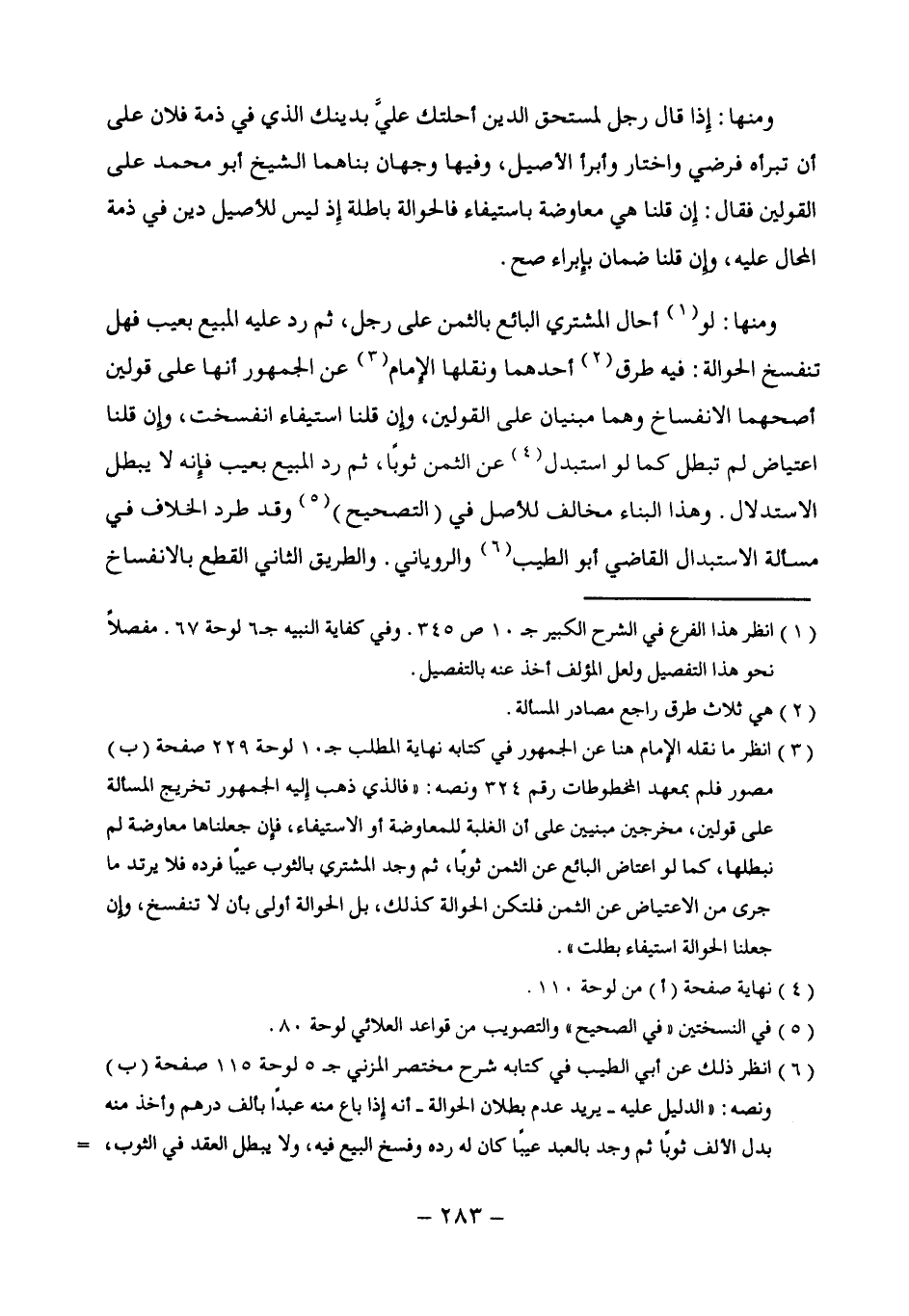(¬3) انظر ما نقله الإمام هنا عن الجمهور في كتابه نهاية المطلب جـ 10 لوحة 229 صفحة (ب) مصور فلم بمعهد المخطوطات رقم 324 ونصه: "فالذى ذهب إِليه الجمهور تخريج المسألة على قولين، مخرجين مبنيين على أن الغلبة للمعاوضة أو الاستيفاء، فإن جعلناها معاوضة لم نبطلها، كما لو اعتاض البائع عن الثمن ثوبًا، ثم وجد المشترى بالثوب عيبًا فرده فلا يرتد ما جرى من الاعتياض عن الثمن فلتكن الحوالة كذلك، بل الحوالة أولى بأن لا تنفسخ، وإن جعلنا الحوالة استيفاء بطلت".
