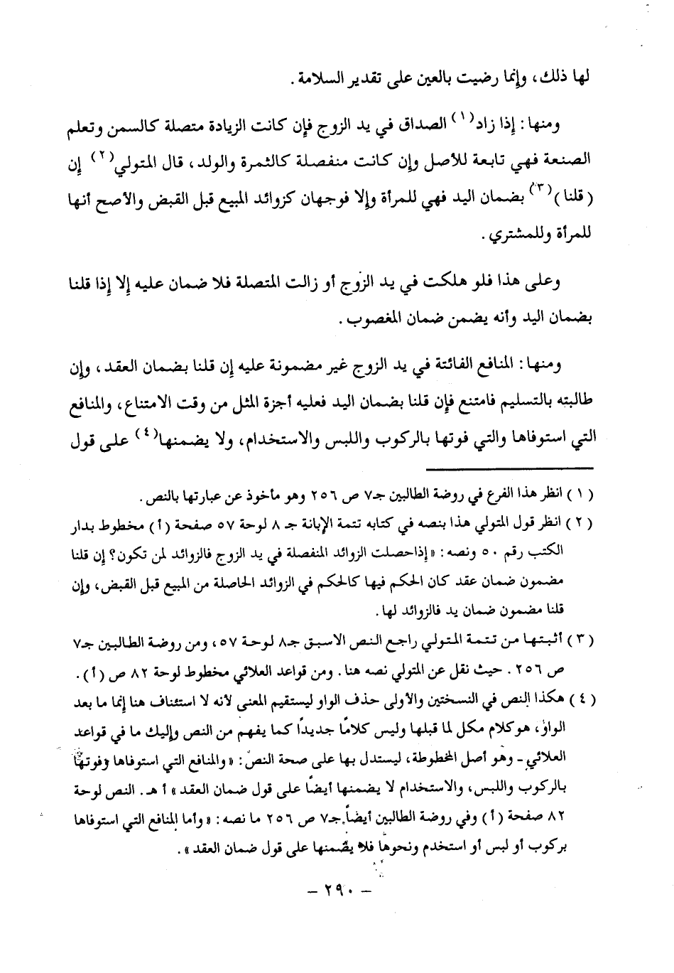 (¬2) انظر قول المتولي هذا بنصه فى كتابه تتمة الإبانة جـ 8 لوحة 57 صفحة (أ) مخطوط بدار الكتب رقم 50 ونصه: "إِذا حصلت الزوائد المنفصلة في يد الزوج فالزوائد لمن تكون؟ إِن قلنا مضمون ضمان عقد كان الحكم فيها كالحكم في الزوائد الحاصلة من المبيع قبل القبض، وإن قلنا مضمون ضمان يد فالزوائد لها.