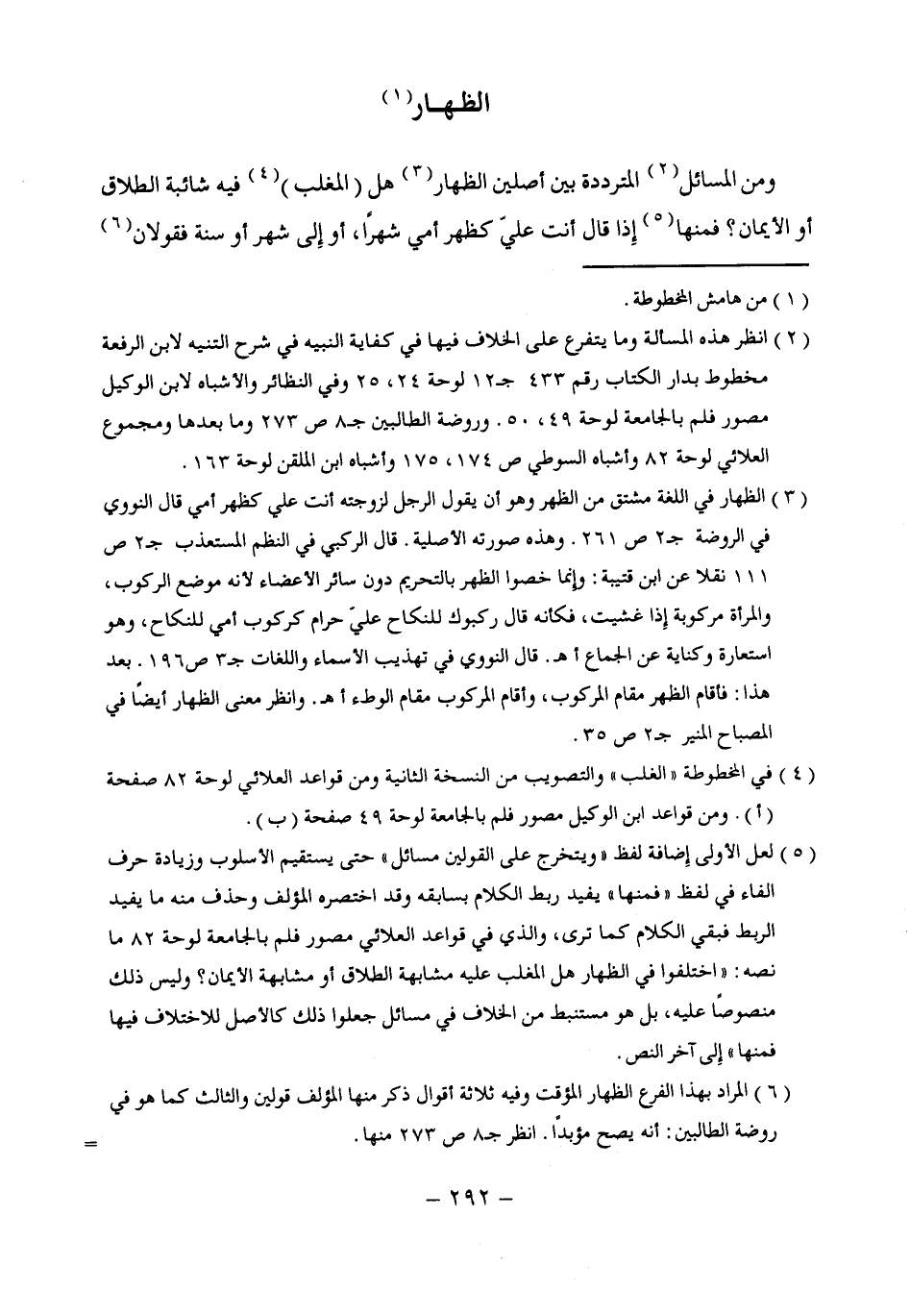 (¬5) لعل الأولى إضافة لفظ "ويتخرج على القولين مسائل" حتى يستقيم الأسلوب وزيادة حرف الفاء فى لفظ "فمنها" يفيد ربط الكلام بسابقه وقد اختصره المؤلف وحذف منه ما يفيد الربط فبقي الكلام كما ترى، والذى في قواعد العلائى مصور فلم بالجامعة لوحة 82 ما نصه: "اختلفوا في الظهار هل المغلب عليه مشابهة الطلاق أو مشابهة الأيمان؟ وليس ذلك منصوصًا عليه، بل هو مستنبط من الخلاف في مسائل جعلوا ذلك كالأصل للاختلاف فيها فمنها" إلى آخر النص.