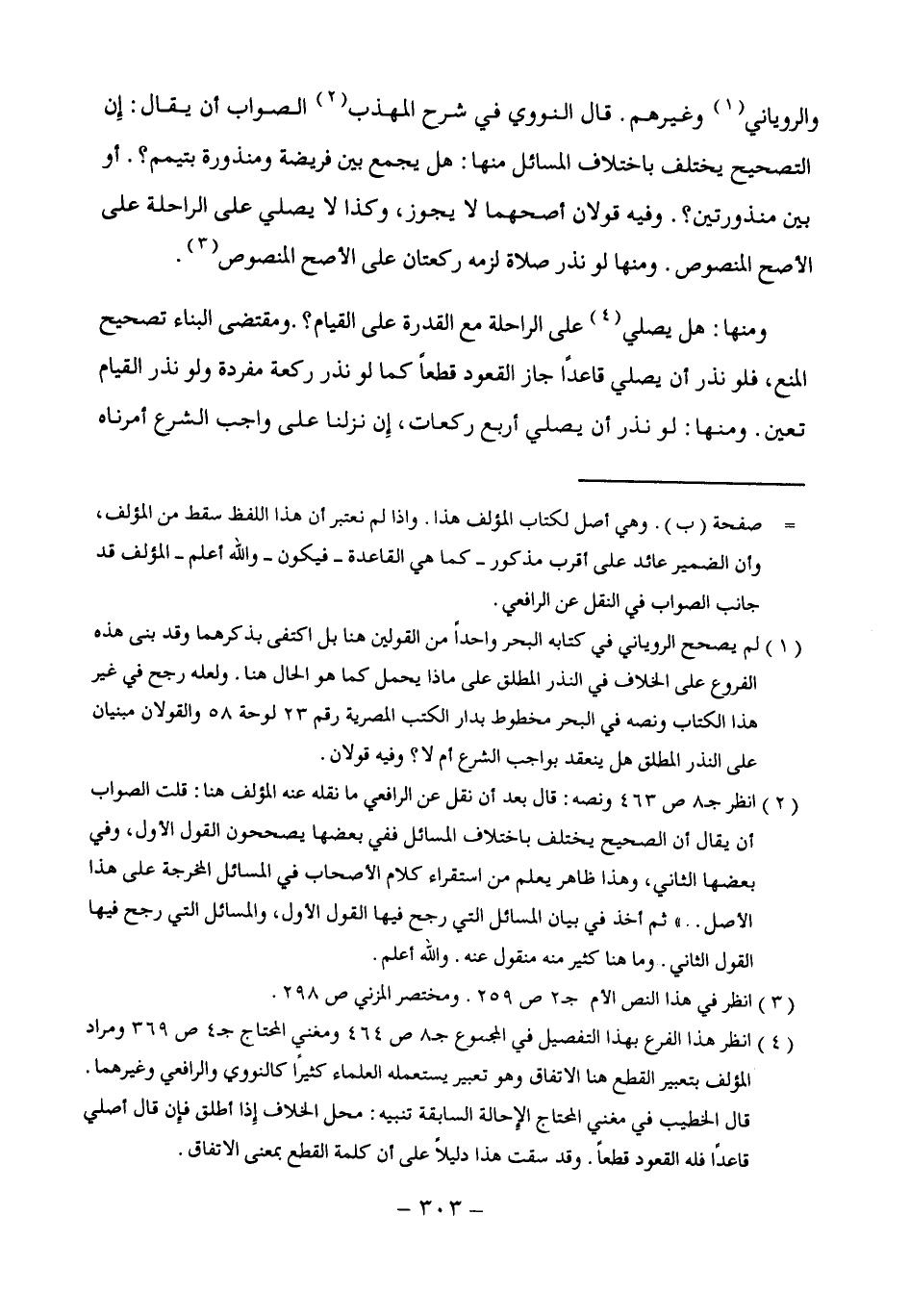 (¬1) لم يصحح الروياني في كتابه البحر واحداً من القولين هنا بل اكتفى بذكرهما وقد بنى هذه الفروع على الخلاف في النذر المطلق على ماذا يحمل كما هو الحال هنا. ولعله رجح في غير هذا الكتاب ونصه في البحر مخطوط بدار الكتب المصرية رقم 23 لوحة 58 والقولان مبنيان على النذر المطلق هل ينعقد بواجب الشرع أم لا؟ وفيه قولان.