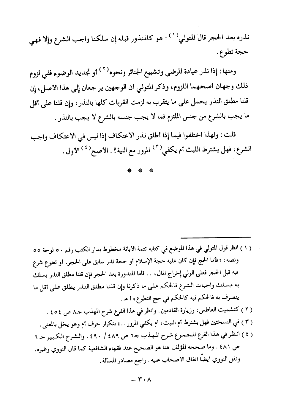 (¬1) انظر قول المتولي في هذا الموضع في كتابه تتمة الإبانة مخطوط بدار الكتب رقم 50 لوحة 55 ونصه: "فأما الحج فإِن كان عليه حجة الإسلام أو حجة نذر سابق على الحجر، أو تطوع شرع فيه قبل الحجر فعلى الولي إِخراج المال، .. فأما المنذورة بعد الحجر فإِن قلنا مطلق النذر يسلك به مسلك واجبات الشرع فالحكم على ما ذكرنا وإن قلنا مطلق النذر يطلق على أقل ما ينصرف به فالحكم فيه كالحكم في حج التطوع" أهـ.