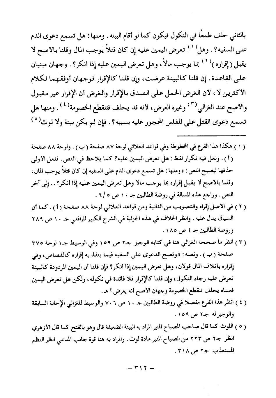 (¬3) انظر ما صححه الغزالي هنا في كتابه الوجيز جـ 2 ص 159 وفي الوسيط جـ 1 لوحة 375 صفحة (ب). ونصه: "وتصح الدعوى على السفيه فيما ينفذ به إقراره كالقصاص، وفي إقراره بإتلاف المال قولان، وهل تعرض اليمين إذا أنكر؟ فإن قلنا أن اليمين المردودة كالبينة تعرض عليه رجاء النكول، وإن قلنا كالإقرار فلا فائدة في نكوله، ولكن هل تعرض اليمين فعساه يحلف تنقطع الخصومة وجهان الأصح أنه يعرض أهـ.