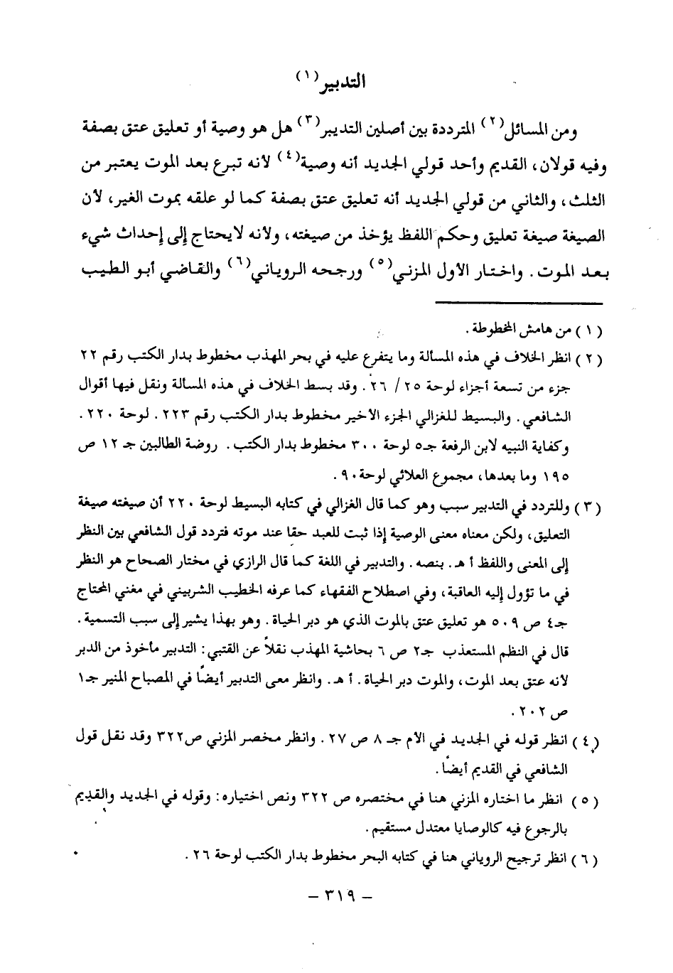 (¬3) وللتردد في التدبير سبب وهو كما قال الغزالي في كتابه البسيط لوحة 220 أن صيغته صيغة التعليق، ولكن معناه معنى الوصية إذا ثبت للعبد حقًا عند موته فتردد قول الشافعي بين النظر إِلى المعنى واللفظ أهـ. بنصه. والتدبير في اللغة كما قال الرازى في مختار الصحاح هو النظر في ما تؤول إليه العاقبة، وفي اصطلاح الفقهاء كما عرفه الخطيب الشربيني في مغني المحتاج جـ 4 ص 509 هو تعليق عتق بالموت الذى هو دبر الحياة. وهو بهذا يشير إِلى سبب التسمية. قال في النظم المستعذب جـ 2 ص 6 بحاشية المهذب نقلاً عن القتبي: التدبير مأخوذ من الدبر لأنه عتق بعد الموت، والموت دبر الحياة. أهـ. وانظر معنى التدبير أيضًا في المصباح المنير جـ 1 ص 202.
