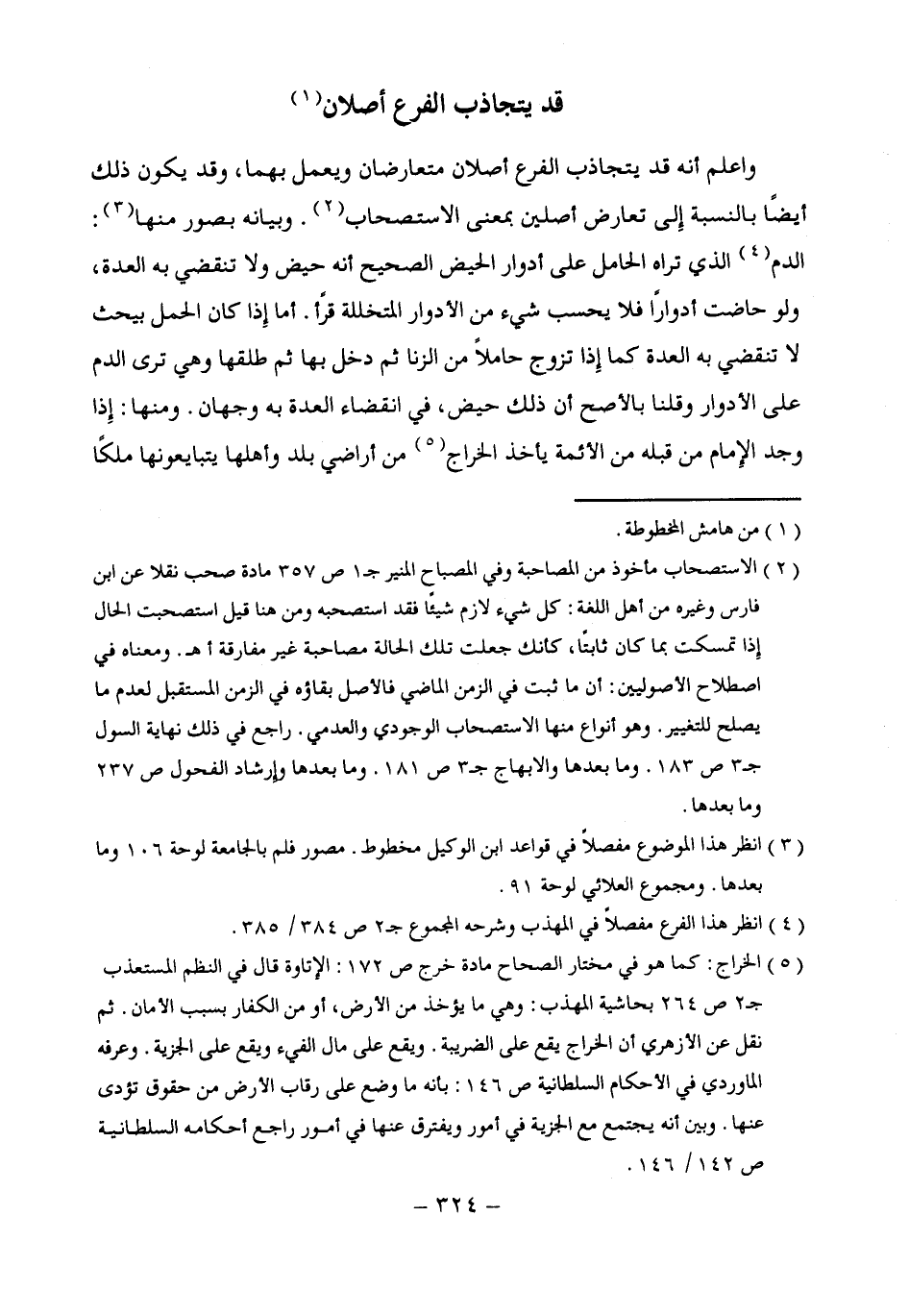 واعلم أنه قد يتجاذب الفرع أصلان متعارضان ويعمل بهما، وقد يكون ذلك أيضًا بالنسبة إِلى تعارض أصلين بمعنى الاستصحاب (¬2). وبيانه بصور منها (¬3): الدم (¬4) الذي تراه الحامل على أدوار الحيض الصحيح أنه حيض ولا تنقضي به العدة، ولو حاضت أدوارًا فلا يحسب شيء من الأدوار المتخللة قرا. أما إِذا كان الحمل بيحث لا تنقضي به العدة كما إذا تزوج حاملاً من الزنا ثم دخل بها ثم طلقها وهي ترى الدم على الأدوار وقلنا بالأصح أن ذلك حيض، في انقضاء العدة به وجهان. ومنها: إِذا وجد الإِمام من قبله من الأئمة يأخذ الخراج (¬5) من أراضي بلد وأهلها يتبايعونها ملكًا
