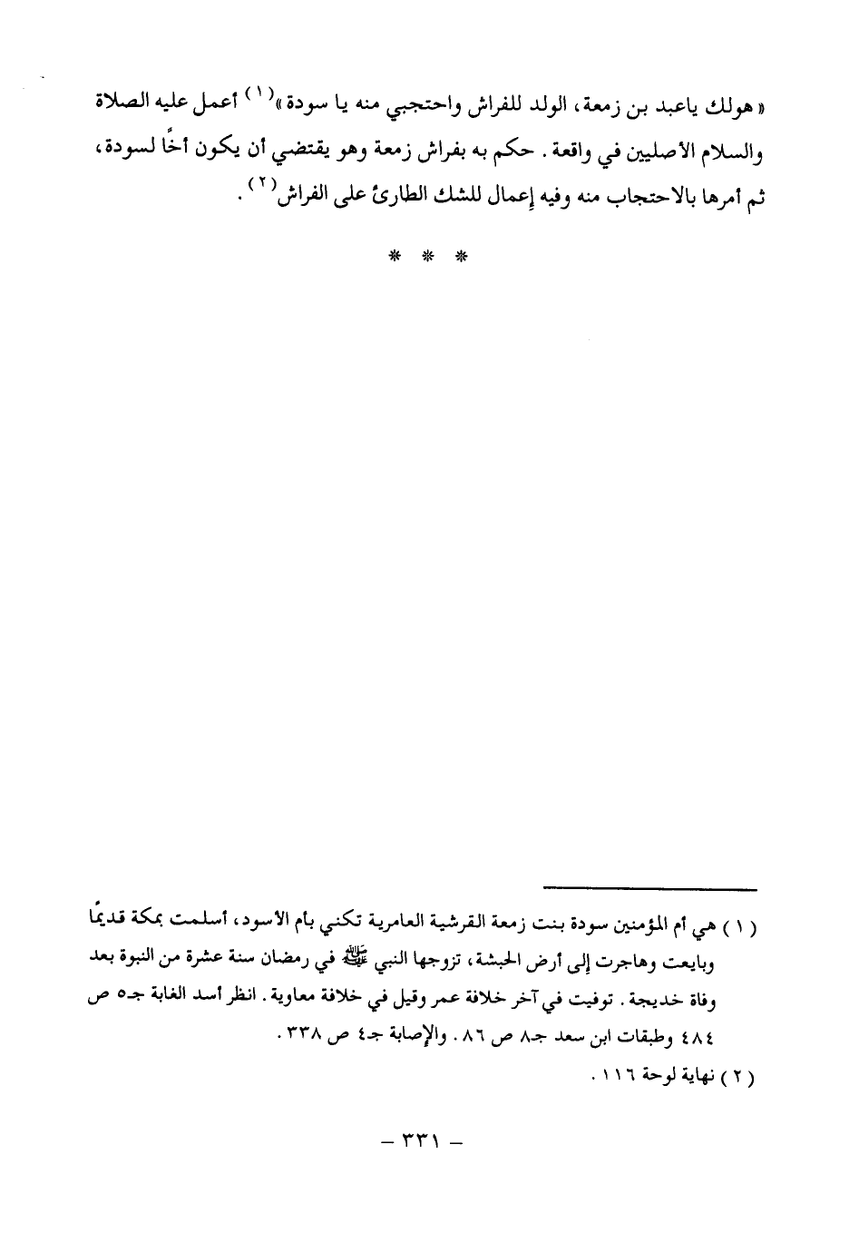"هو لك يا عبد بن زمعة، الولد للفراش واحتجبي منه يا سودة" (¬1) أعمل عليه الصلاة والسلام الأصليين في واقعة. حكم به بفراش زمعة وهو يقتضي أن يكون أخًا لسودة، ثم أمرها بالاحتجاب منه وفيه إِعمال للشك الطارئ على الفراش (¬2).