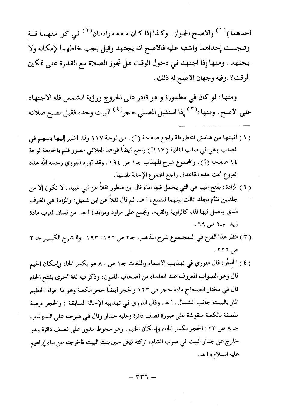 (¬1) أثبتها من هامش المخطوطة راجع صفحة (أ). من لوحة 117 وقد أشير إِليها بسهم في الصلب وهي في صلب الثانية (117 أ) راجع أيضًا قواعد العلائي مصور فلم بالجامعة لوحة 94 صفحة (أ). والمجموع شرح المهذب جـ 1 ص 194. وقد أورد النووي رحمه الله هذه الفروع تحت هذه القاعدة. راجع المجموع الإِحالة نفسها.