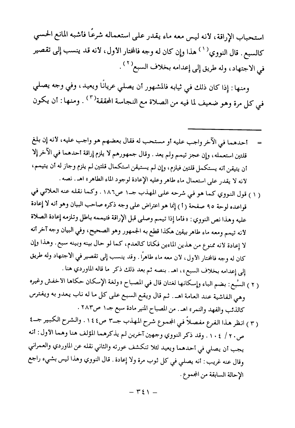 (¬1) قول النووي كما هو في شرحه على المهذب جـ 1 ص 186. وكما نقله عنه العلائي في قواعده لوحة 95 صفحة (أ) إِنما هو اعتراض على وجه ذكره صاحب البيان وهو أنه لا إِعادة عليه وهذا نص النووي: "فأما إِذا تيمم وصلى قبل الإِراقة فتيممه باطل وتلزمه إِعادة الصلاة لأنه تيمم ومعه ماء طاهر بيقين هكذا قطع به الجمهور وهو الصحيح، وفي البيان وجه آخر أنه لا إعادة لأنه ممنوع من هذين الماءين فكانا كالعدم، كما لو حال بينه وبينه سبع. وهذا وإِن كان له وجه فالمختار الأول؛ لأن معه ماء طاهرًا. وقد ينسب إِلى تقصير في الاجتهاد وله طريق إِلى إِعدامه بخلاف السبع"، اهـ. بنصه ثم بعد ذلك ذكر ما قاله الماوردى هنا.