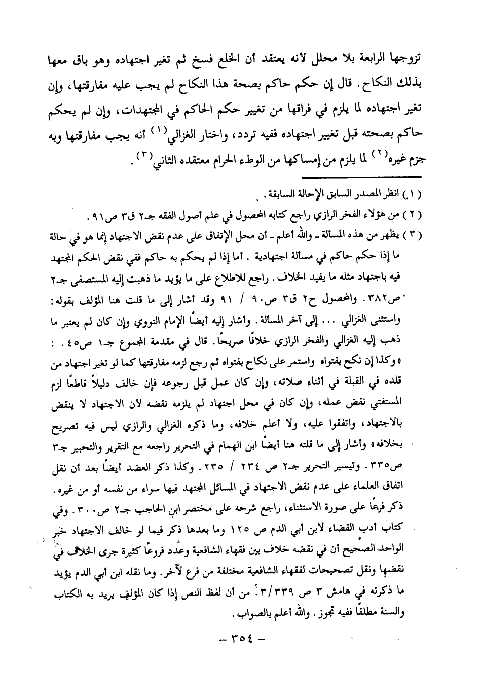 (¬3) يظهر من هذه المسألة - والله أعلم - أن محل الإِتفاق على عدم نقض الاجتهاد إِنما هو في حالة ما إِذا حكم حاكم في مسألة اجتهادية. أما إِذا لم يحكم به حاكم ففي نقض الحكم المجتهد فيه باجتهاد مثله ما يفيد الخلاف. راجع للاطلاع على ما يؤيد ما ذهبت إِليه المستصفى جـ 2 ص 382. والمحصول ح 2 ق 3 ص 90/ 91 وقد أشار إِلى ما قلت هنا المؤلف بقوله: واستثنى الغزالي ... إلى آخر المسألة. وأشار إِليه أيضًا الإِمام النووي وإِن كان لم يعتبر ما ذهب إِليه الغزالي والفخر الرازى خلافًا صريحًا. قال في مقدمة المجموع جـ 1 ص 45: "وكذا إن نكح بفتواه واستمر على نكاح بفتواه ثم رجع لزمه مفارقتها كما لو تغير اجتهاد من قلده في القبلة في أثناء صلاته، وإِن كان عمل قبل رجوعه فإِن خالف دليلاً قاطعًا لزم المستفتي نقض عمله، وإِن كان في محل اجتهاد لم يلزمه نقضه لأن الاجتهاد لا ينقض بالاجتهاد، واتفقوا عليه، ولا أعلم خلافه، وما ذكره الغزالى والرازى ليس فيه تصريح بخلافه" وأشار إلى ما قلته هنا أيضًا ابن الهمام في التحرير راجعه مع التقرير والتحبير جـ 3 ص 335. وتيسير التحرير جـ 2 ص 234/ 235. وكذا ذكر العضد أيضًا بعد أن نقل اتفاق العلماء على عدم نقض الاجتهاد في المسائل المجتهد فيها سواء من نفسه أو من غيره. ذكر فرعًا على صورة الاستثناء، راجع شرحه على مختصر ابن الحاجب جـ 2 ص 300. وفي كتاب أدب القضاء لابن أبي الدم ص 125 وما بعدها ذكر فيما لو خالف الاجتهاد خبر الواحد الصحيح أن في نقضه خلاف بين فقهاء الشافعية وعدد فروعًا كثيرة جرى الخلاف في نقضها ونقل تصحيحات لفقهاء الشافعية مختلفة من فرع لآخر. وما نقله ابن أبي الدم يؤيد ما ذكرته في هامش 3 ص 339/ 3. من أن لفظ النص إِذا كان المؤلف يريد به الكتاب والسنة مطلقًا ففيه تجوز. والله أعلم بالصواب.