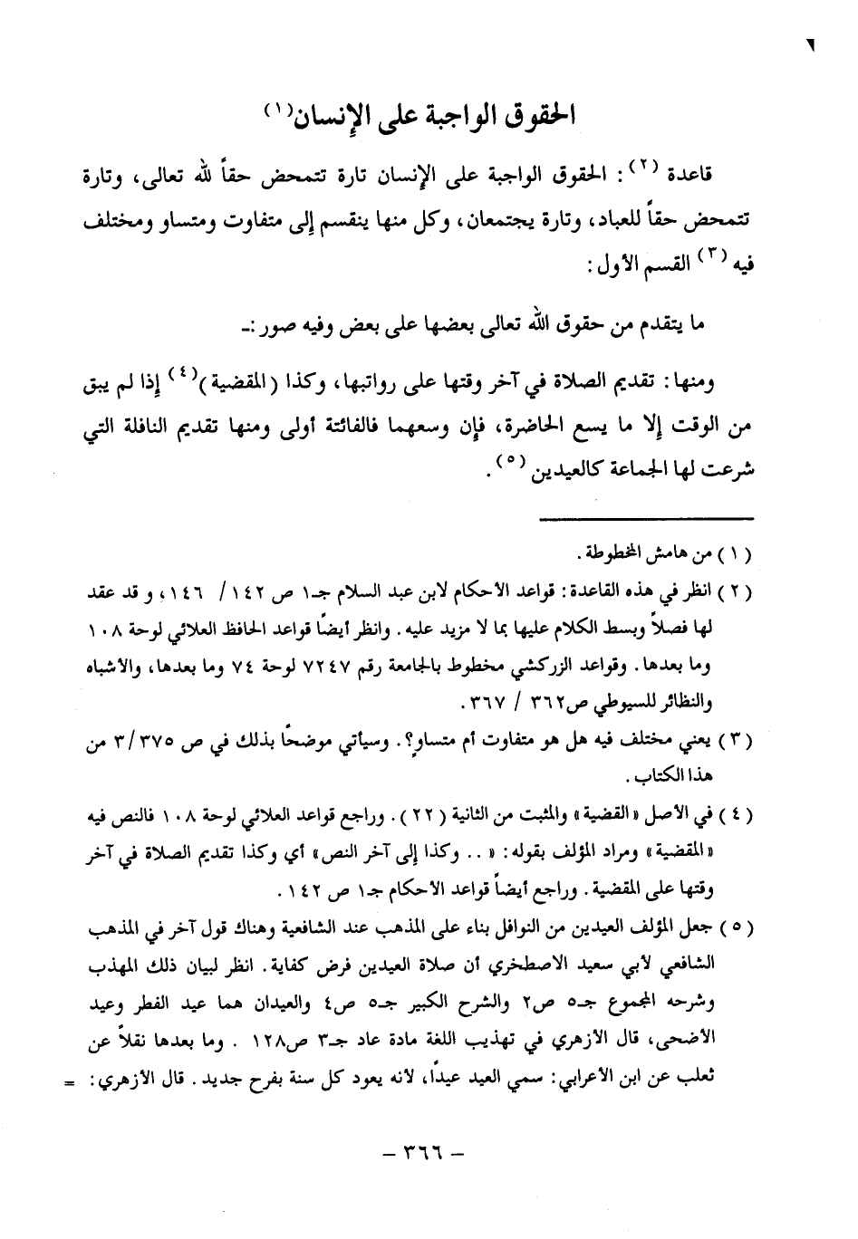 (¬4) في الأصل "القضية" والمثبت من الثانية (22). وراجع قواعد العلائي لوحة 108 فالنص فيه "المقضية" ومراد المؤلف بقوله: " .. وكذا إلى آخر النص" أي وكذا تقديم الصلاة في آخر وقتها على المقضية. وراجع أيضاً قواعد الأحكام جـ 1 ص 142.